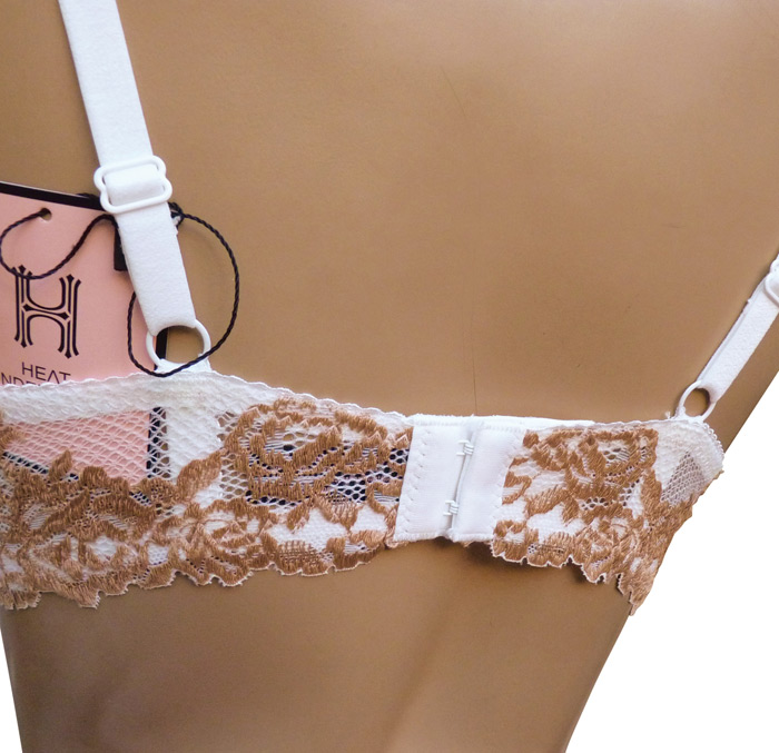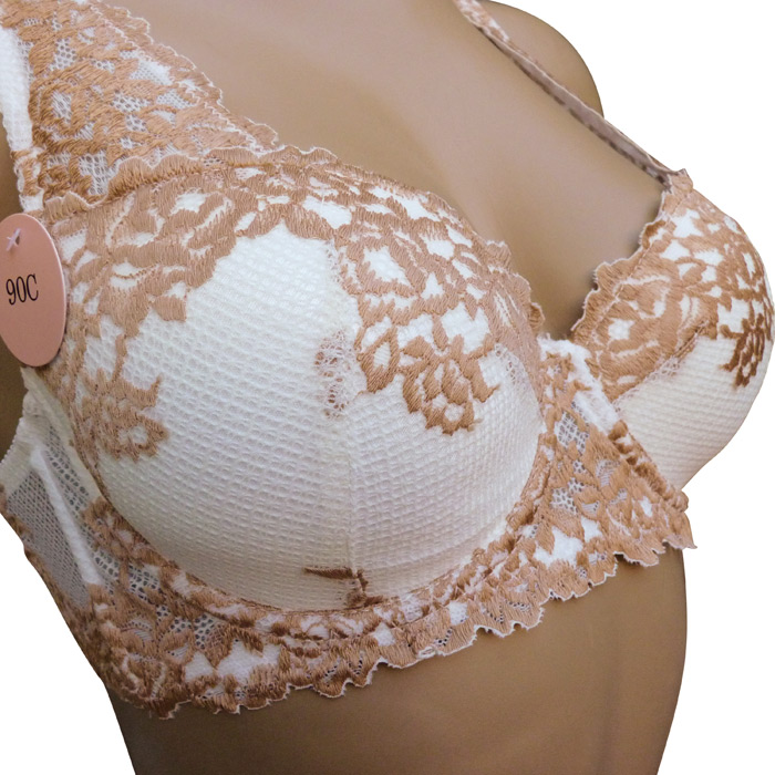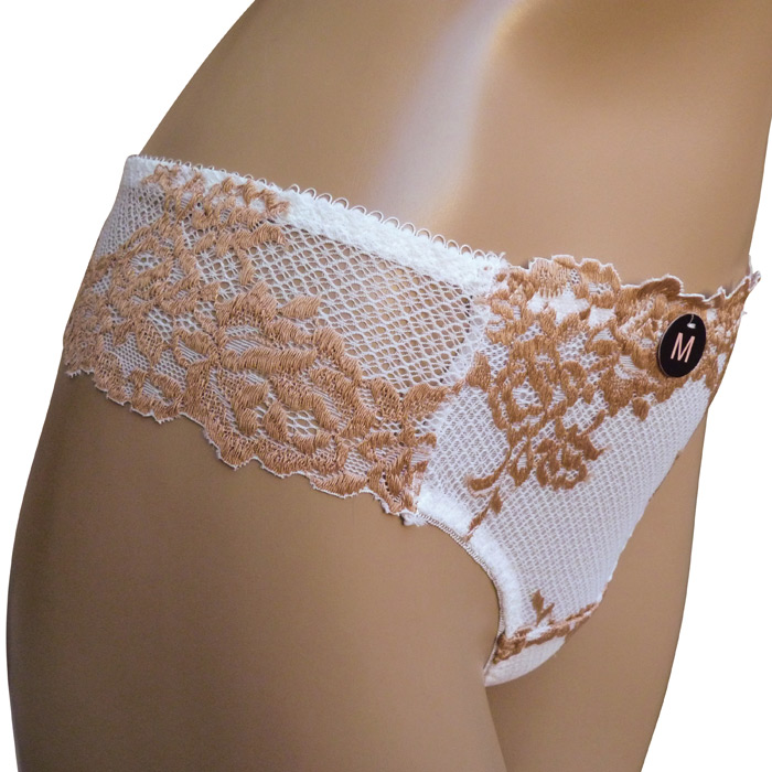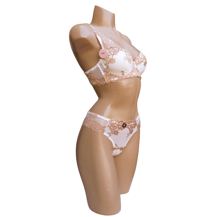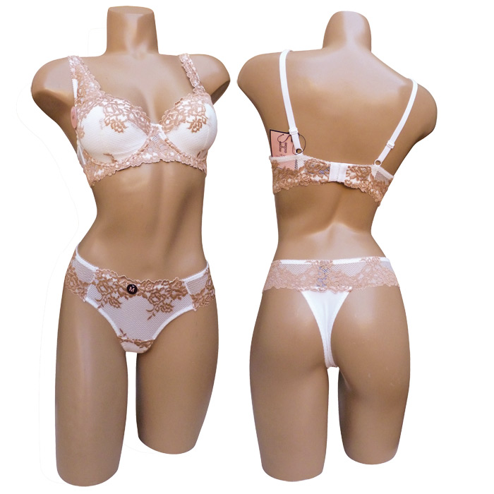 Ensemble soutien gorge blanc/beige avec tanga. Soutien gorge bonnet C avec armatures. Soutien gorge coques souples, broderie sur maille filet stretch sur l'ensemble des bonnets. Brides réglables et non amovibles. Tanga en dentelle rappel broderie "fleurs brodées". 4 tailles.
