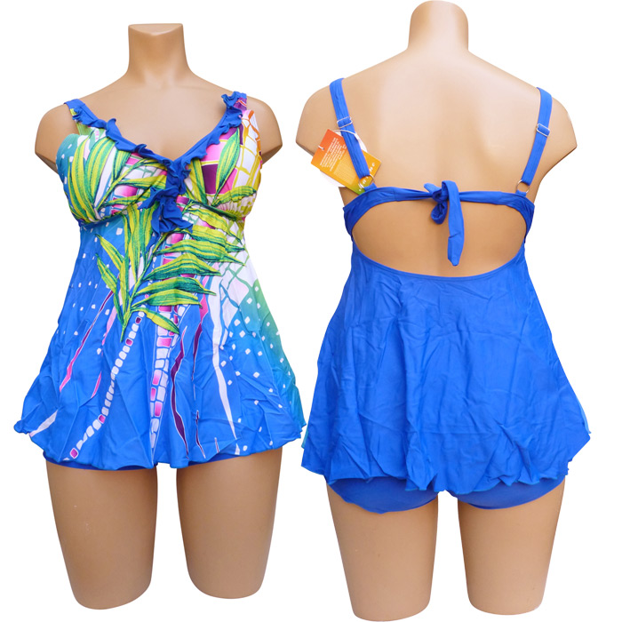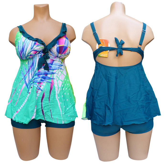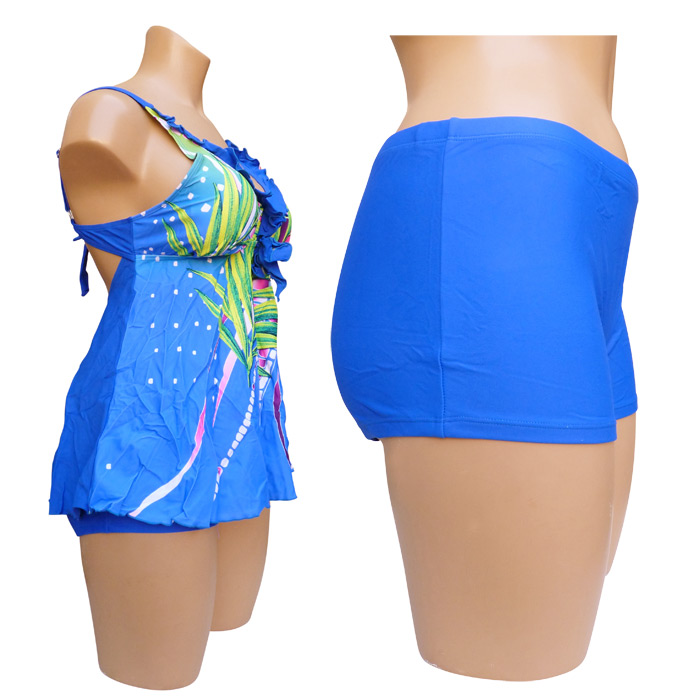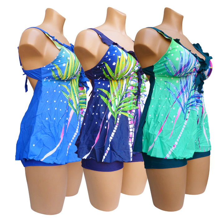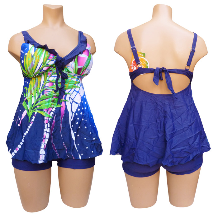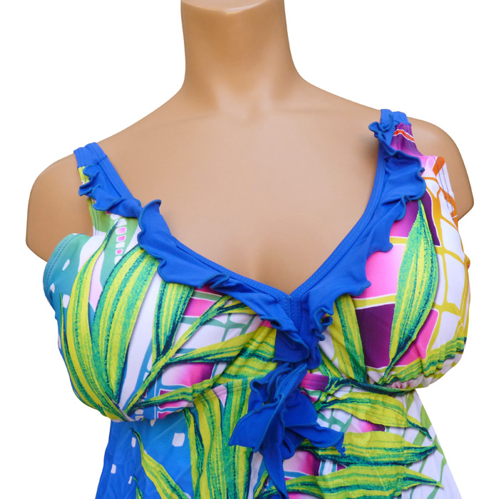 Tankini très grande taille avec son boxer. Haut du maillot imprimé "fleurs des îles, palmiers...etc" sur le devant et uni sur le derrière. Soutien gorge forme triangle orné d'un mini volant et d'un nœud entre-bonnet, mousses amovibles. Coupe évasée. Bretelles ajustables et non amovibles, attache dans le dos par un nœud. Boxer entièrement doublé, uni, élastiquée à la taille. 5 tailles.