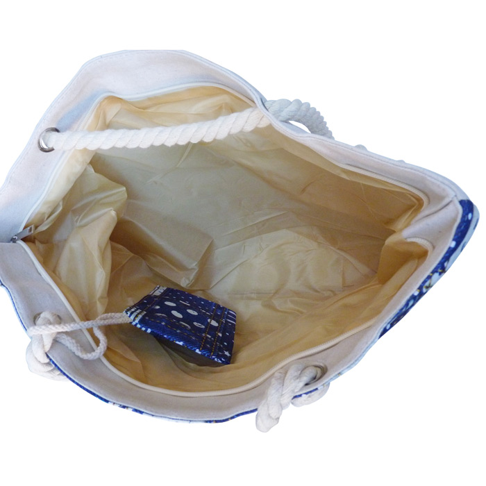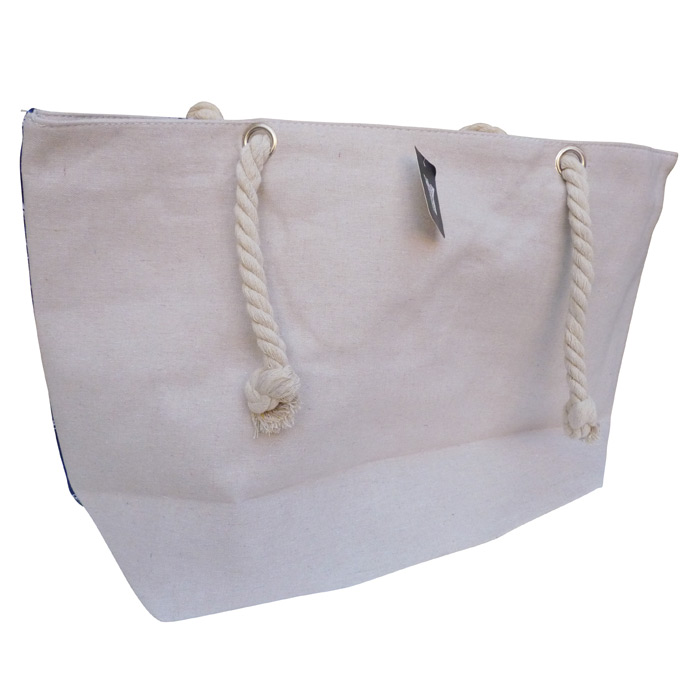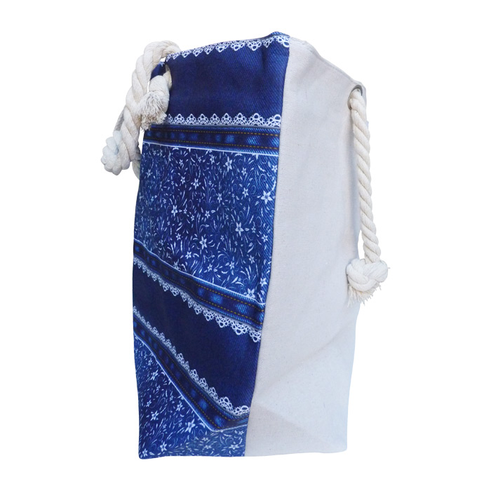 Lot de 3 sacs de plage avec petite poche intérieur, fermeture éclair sur le haut. Fond du sac Doublé. Livré avec petite pochette à fermeture. Imprimé imitation "jean". Bandoulières en corde de marin et nœuds "marins". Hauteur=36cm, Largeur=56cm , Base=18cm.