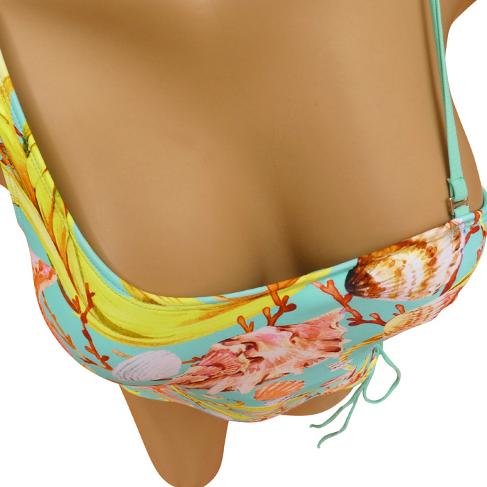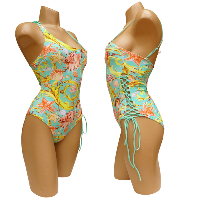 Maillot de bain femme 1 pièce entièrement doublé, avec découpe original. Mousses intégrées. Brides épaules. Livré avec une bretelle amovible et réglable. Maillot de bain ajouré (laçage) sur le côté gauche de la hanche. Imprimé coquillage sur l'ensemble du maillot. 4 tailles : de 36 à 42.