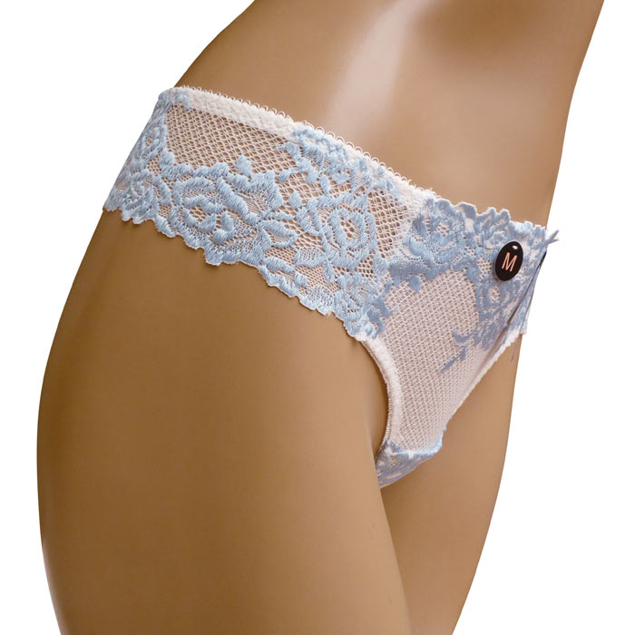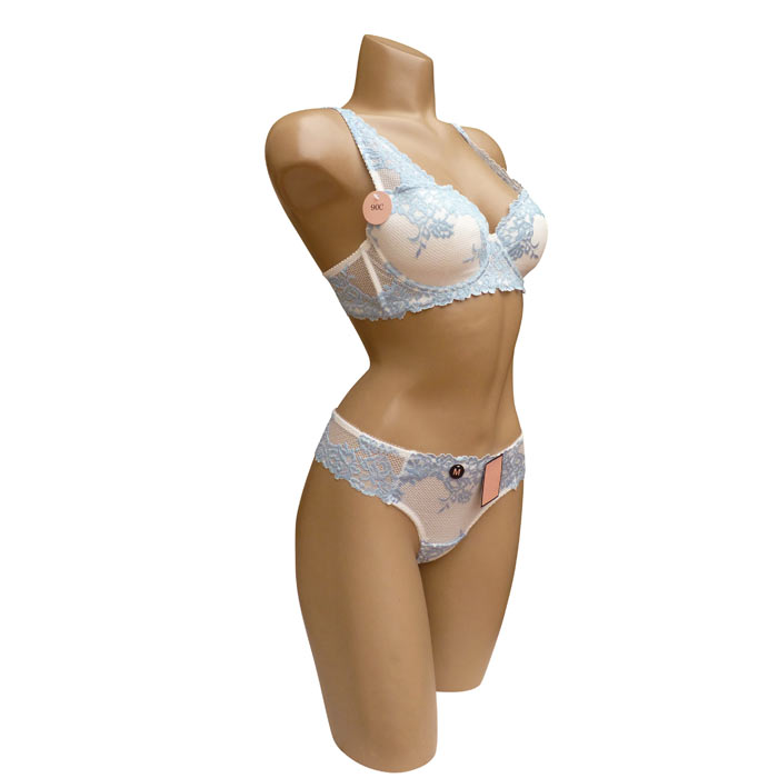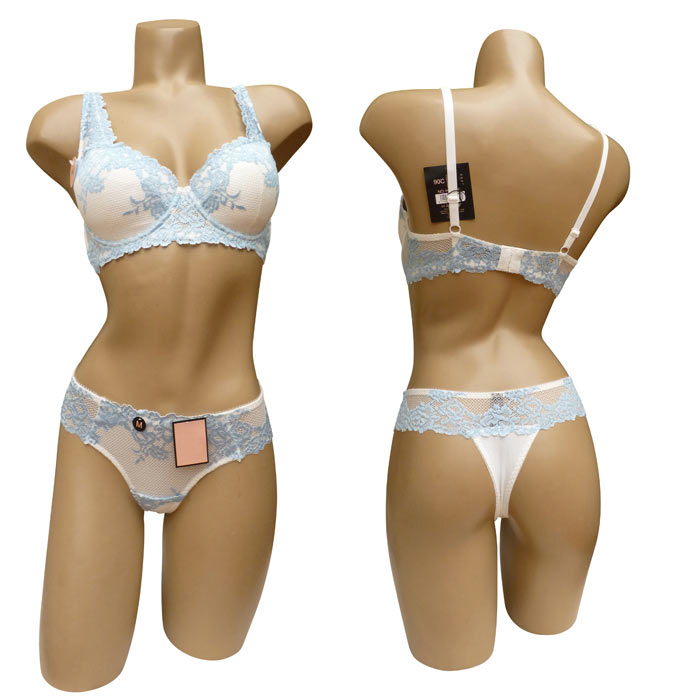 Ensemble soutien gorge bleu ciel/blanc avec tanga. Soutien gorge bonnet C avec armatures. Soutien gorge coques souples, broderie sur maille filet stretch sur l'ensemble des bonnets. Brides réglables et non amovibles. Tanga en dentelle rappel broderie "fleurs brodées". 4 tailles.