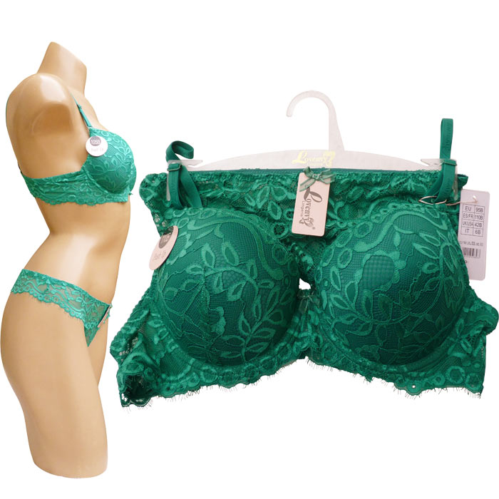 Ensemble soutien gorge vert avec brésilien. Soutien gorge rembourré "Pusch up" bonnet B avec armatures. Bonnets dentelle, broderie sur maille filet stretch. Dentelé sous bonnet. Soutien gorge nœud satiné ton sur ton entre-bonnet. Brides réglables et amovibles. Brésilien dentelle "fleurs brodées" sur l'ensemble. 5 tailles.