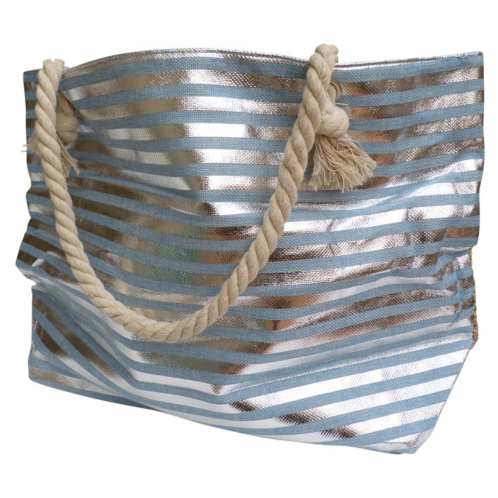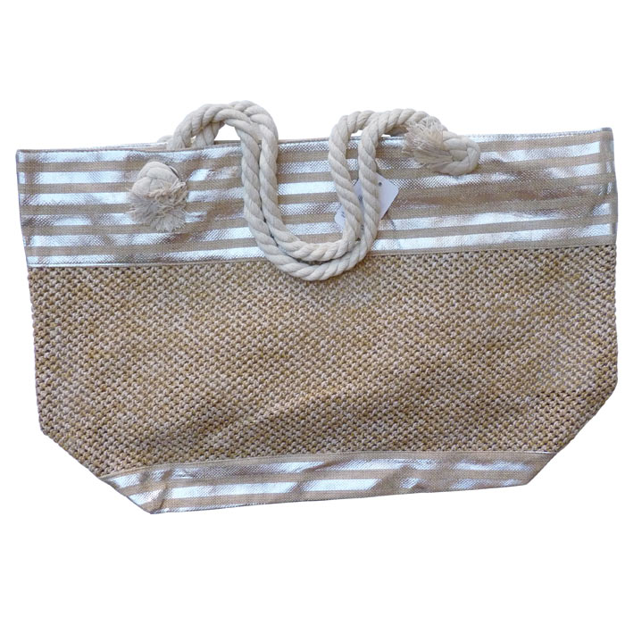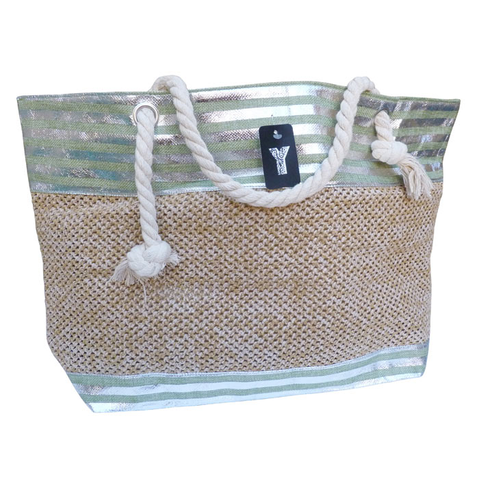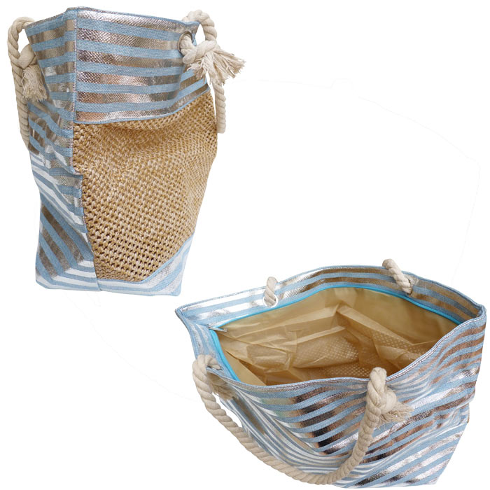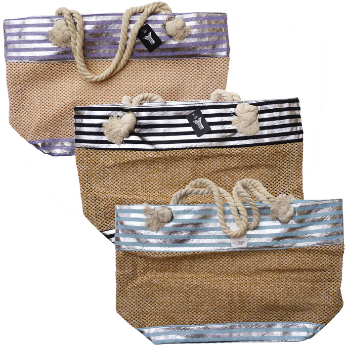 Lot de 5 sacs de plage fermeture éclair sur le haut. Fond du sac Doublé. Imprimé "rayures brillantes horizontales " et tressage sur un côté du sac, coté opposé rayures sur l'ensemble. Bandoulières en corde de marin et nœuds "marins". Hauteur=35cm, Largeur=56cm , Base=17cm.