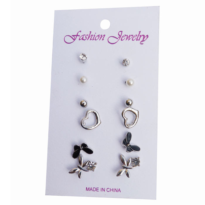 Lot de 6 paires de boucles d oreilles argentées avec strass, perle. Forme différents : cœur, feuilles, perle, papillons etc...