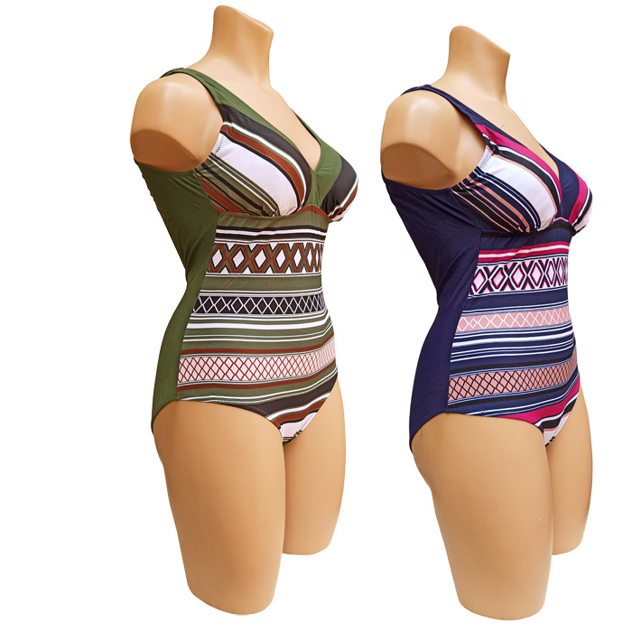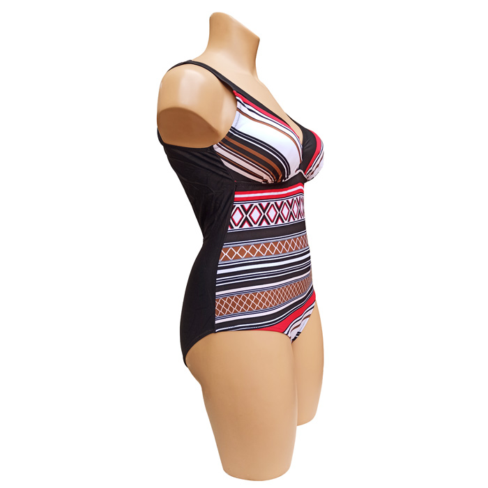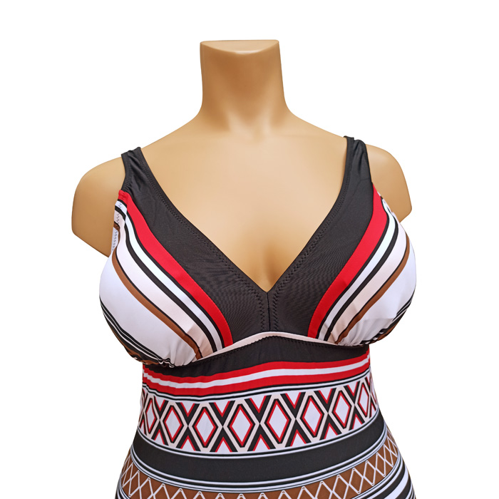 Maillot de bain femme 1 pièce, entièrement doublé, grande taille. Soutien gorge forme triangle avec coussinets mousses amovibles. Imprimé graphique sur le devant du maillot, type "aztèque", dos uni. Échancrure dos. Bretelles épaules. 3 couleurs et 4 tailles proposées.