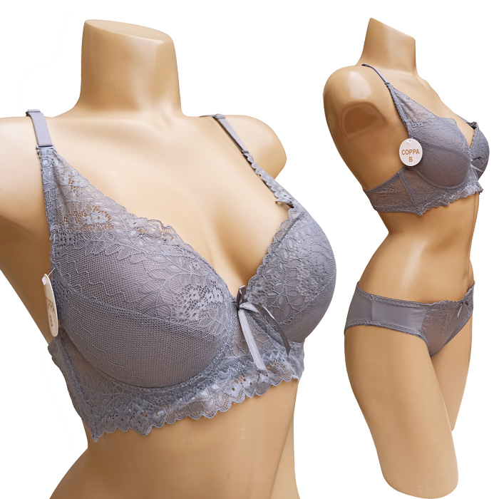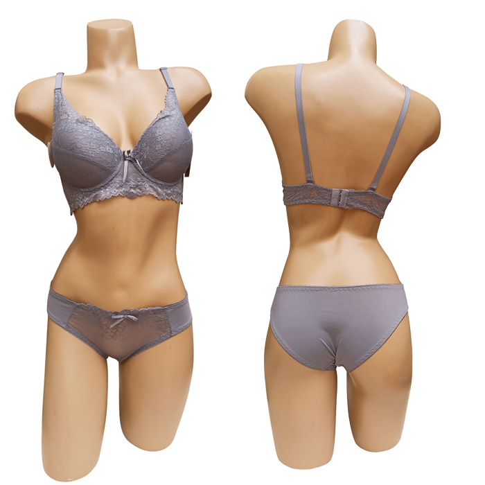Ensemble soutien gorge avec slip. Soutien gorge bonnet B avec armatures. Soutien gorge coques souples et préformées. Broderie sur maille filet stretch. Bande dentelle sous poitrine . Soutien gorge nœud satiné ton sur ton entre-bonnet. Brides réglables et amovibles. Fermeture dos 2agrafes et 3 positions d'accroches. Slip triangle de dentelle sur le devant, uni sur l'arrière doublé sur le fond. 6 tailles de soutien-gorge.