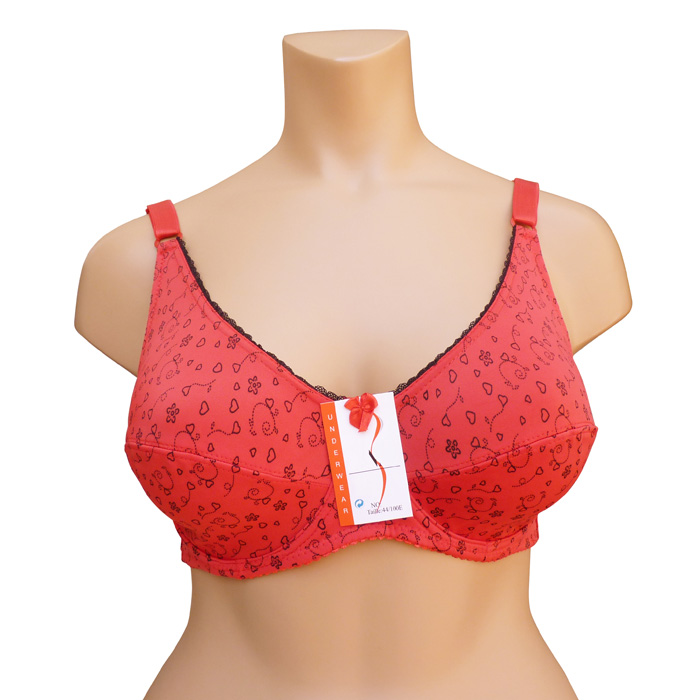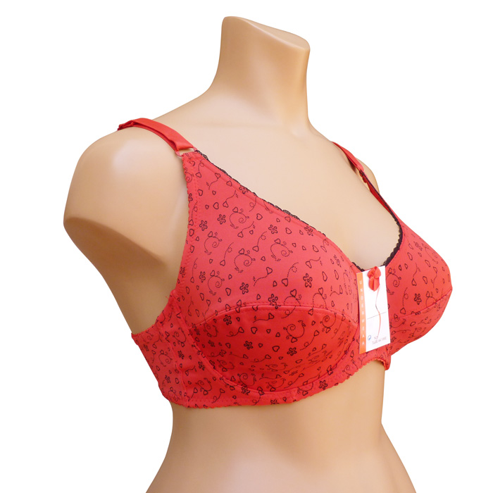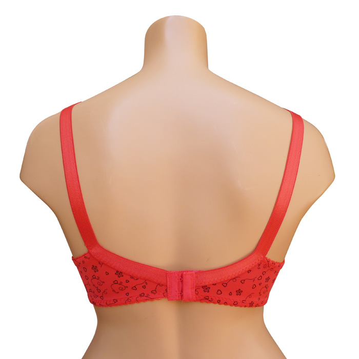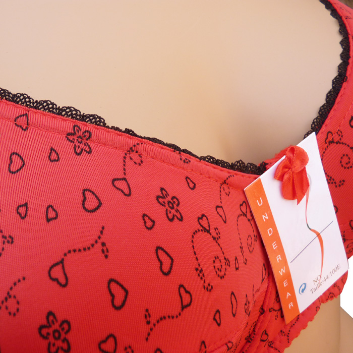 Soutien gorge, Bonnet E. Soutien gorge avec armatures et non rembourré. Imprimé "cœurs, fleurs etc..." sur l'ensemble du bonnet. 2 agrafes au dos avec 3 positions. 6 tailles : 100E au 125E.