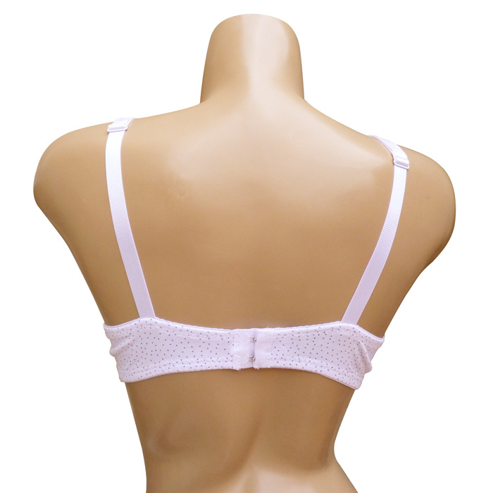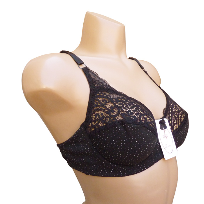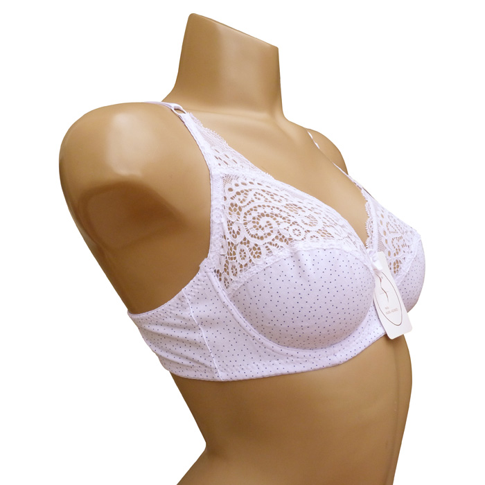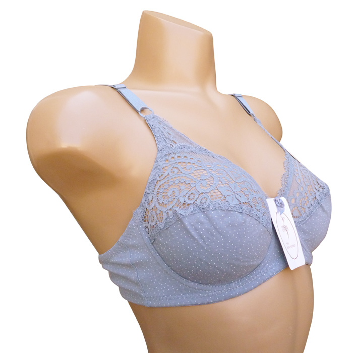 Soutien gorge grande taille, Bonnet D, coton majoritaire. Soutien gorge avec armatures et non rembourré. Soutien gorge uni avec motif "pois" sur la partie inférieure et fleurs brodées sur la partie supérieure. Brides réglables. Ouverture dos, 2 agrafes triple positions d'accroches. 6 Tailles : 95D à 120D.