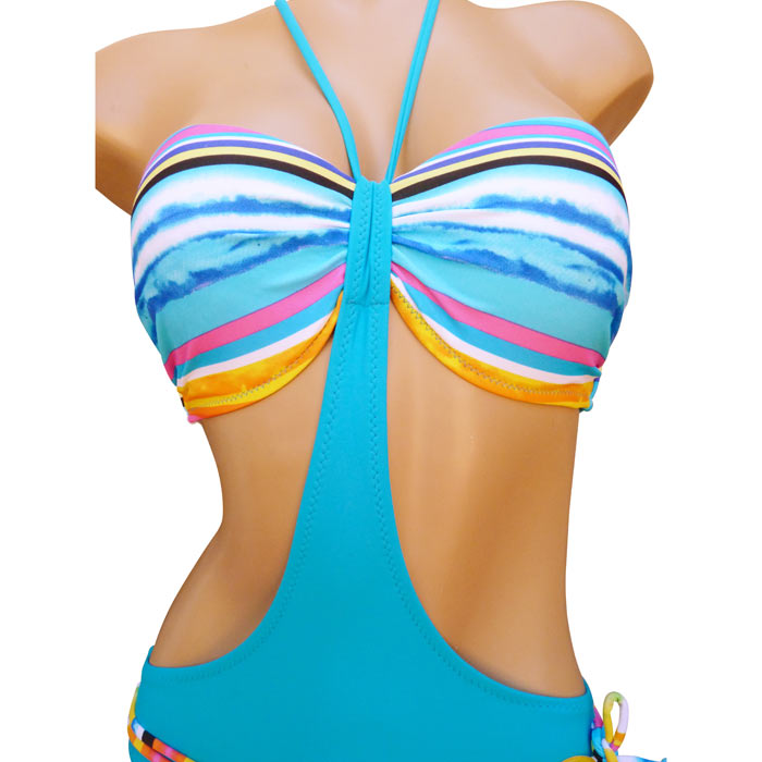 Trikini entièrement doublé. Soutien gorge forme bandeau rembourré coqués. Trikini décliné dans 4 coloris différents avec imprimé rayures multicolores sur le soutien gorge. Se noue dans le cou et se clipse dans le dos. Slip orné d'une ceinture terminée par une boucle sur le côté. 4 tailles : de 36/38 à 42/44.