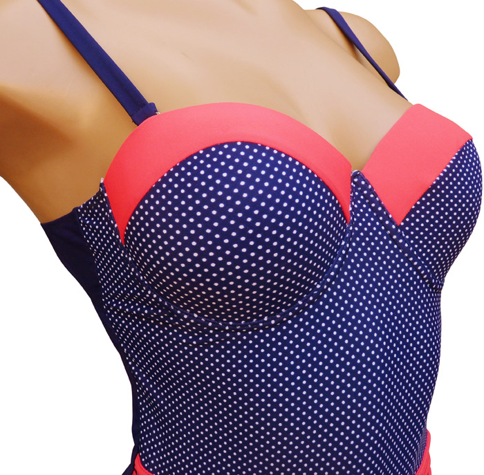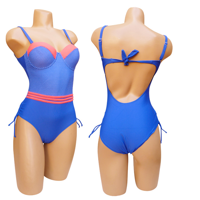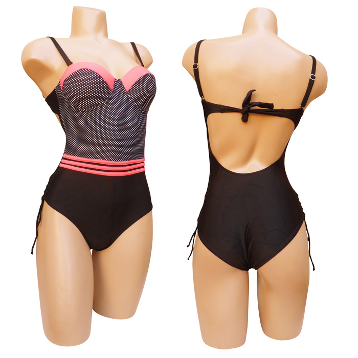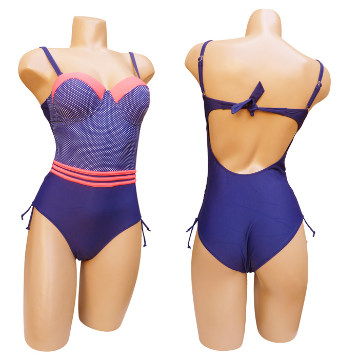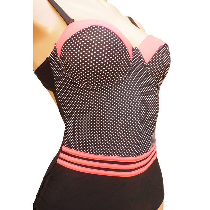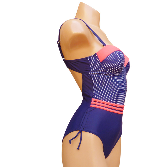 Maillot de bain femme 1 pièce, doublé devant. Soutien gorge forme bandeau, coques avec armatures. Soutien gorge imprimé "petit pois" sur les bonnets, souligné par 3 liserés horizontales contrastés au niveau de la taille. Partie basse du maillot uni avec lacet de resserrage de chaque côté. Bretelles réglables et amovibles avec attache dans le dos. L''arrière du maillot est uni. 3 couleurs sont proposées dans le paquet. 5 tailles indiquées sur étiquette.
