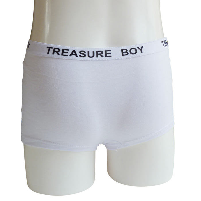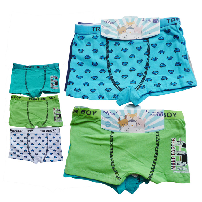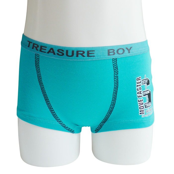 Boxer garçon, coton majoritaire. Doublé à l'avant. Ceinture élastiquée avec inscription "Treasure boy" à la taille. Motif différents sur le devant, uni sur le derrière. 4 tailles : 2/4 ans - 5/7 ans - 8/10 ans - 11/12 ans