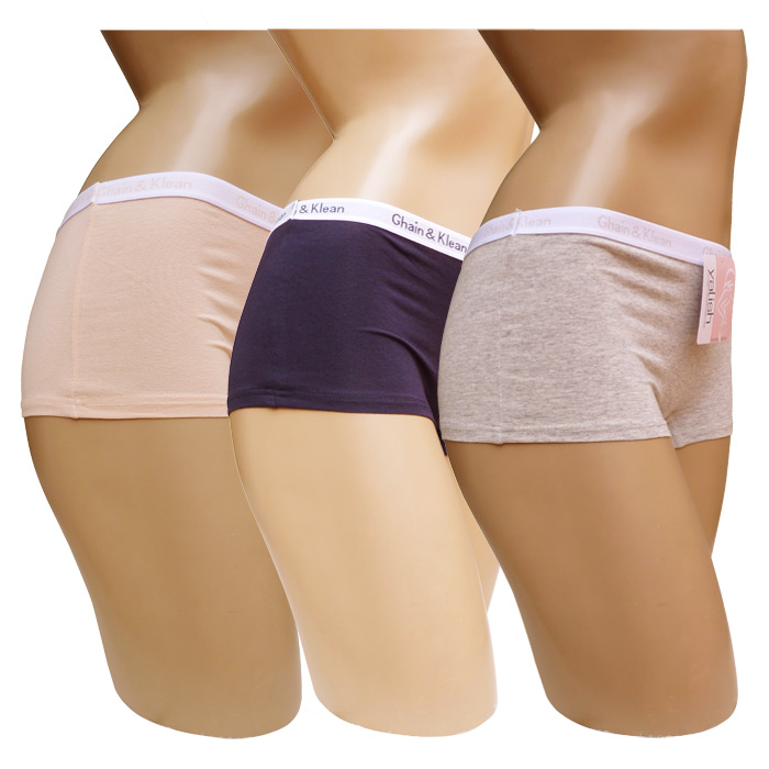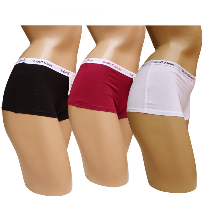 Boxer femme, coton majoritaire. Boxer élastiqué à la taille avec inscription "Ghain Klean". 3 tailles : M-L-XL