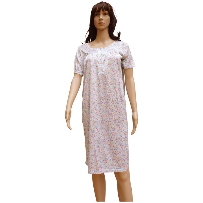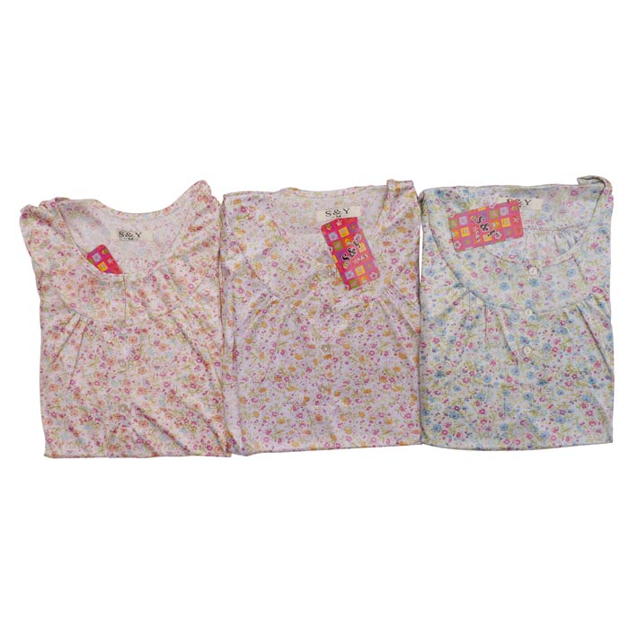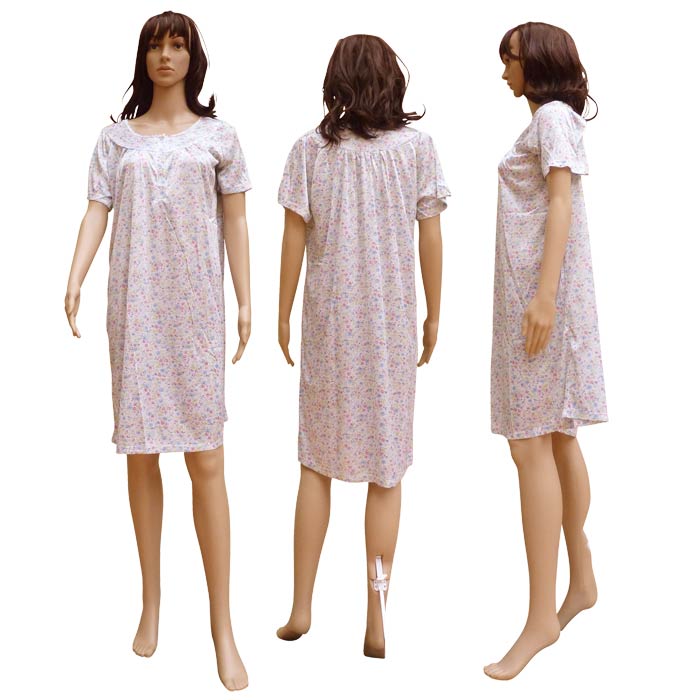 Chemise de nuit longue, tissu léger et frais. Manches courtes. Col arrondi boutonné, imprimé "fleurs". 4 tailles indiquées sur étiquette M-L-XL-2XL. Vendu par lot de 4 pièces.