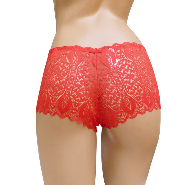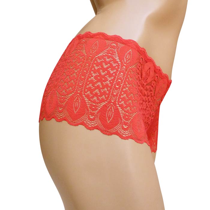 Boxer femme en dentelle. Fleurs brodées sur maille filet stretch, avec zones ajourées. Élastiquée à la taille. Fond de la culotte doublé. 2 tailles.