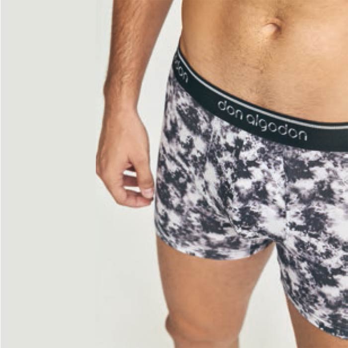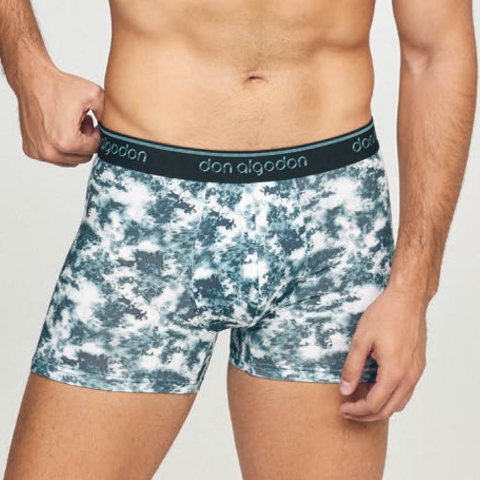 Collection prestige boxer homme. Coton majoritaire. Sur fond uni Motifs "nuages" sur l'ensemble du boxer. Ceinture taille plate "gomme" avec inscription "Don Algodon". 1 taille XL.