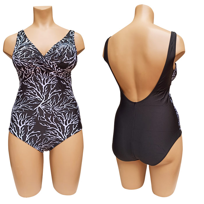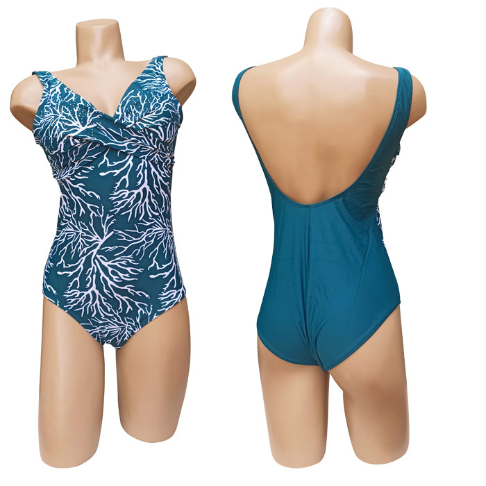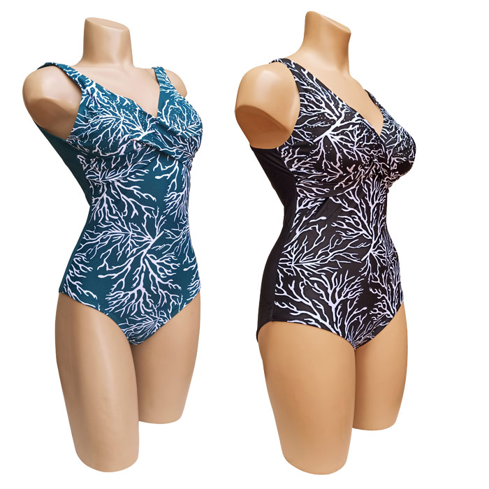 Maillot de bain femme 1 pièce, doublé entièrement. Soutien gorge forme triangle, mousses intégrées et amovibles. Imprimé graphique "type feuilles" sur l'ensemble du maillot à l'avant avec strass au niveau des bonnets. 3 couleurs proposées dans le paquet. Bretelles épaules. 4 tailles: du 38 à 44.