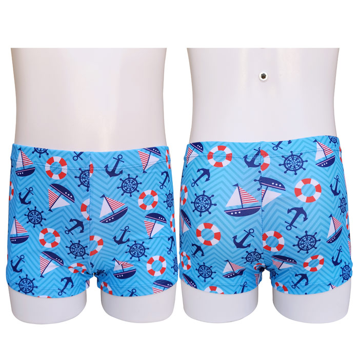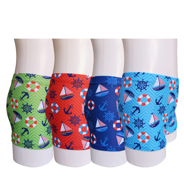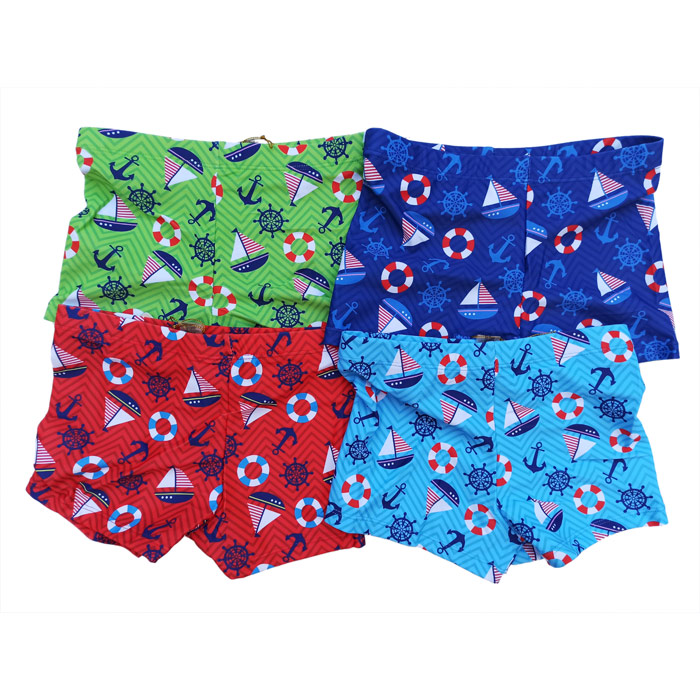 Boxer de bain garçon, doublé d'un fin filet intérieur à l'avant, taille élastiquée. Boxer de bain avec motif "bateaux, voiles, bouées..etc" sur l'ensemble du boxer de bain. 4 tailles : 2 ans à 8 ans. 4 couleurs différentes.