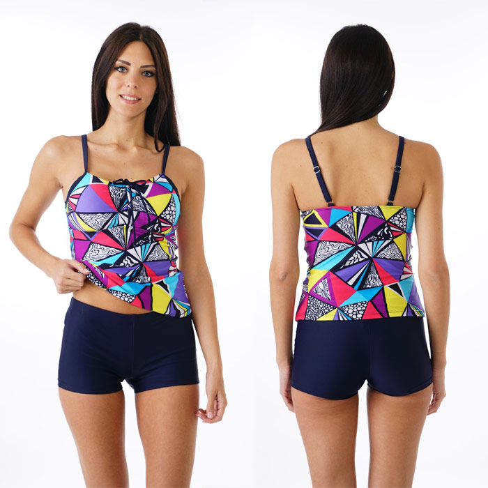 Tankini, 2 pièces avec Boxer. Haut du maillot imprimé "coloré graphique" sur l'ensemble. Soutien gorge forme bandeau avec coussinets mousses amovibles. Lien de resserrage entre-bonnet. Bretelles ajustables et non amovibles. Boxer entièrement uni, doublé à l'avant. 6 tailles 32 à 42.