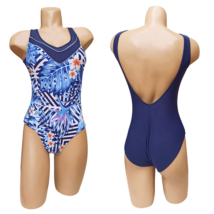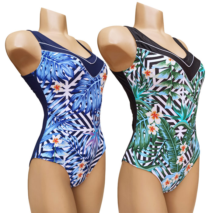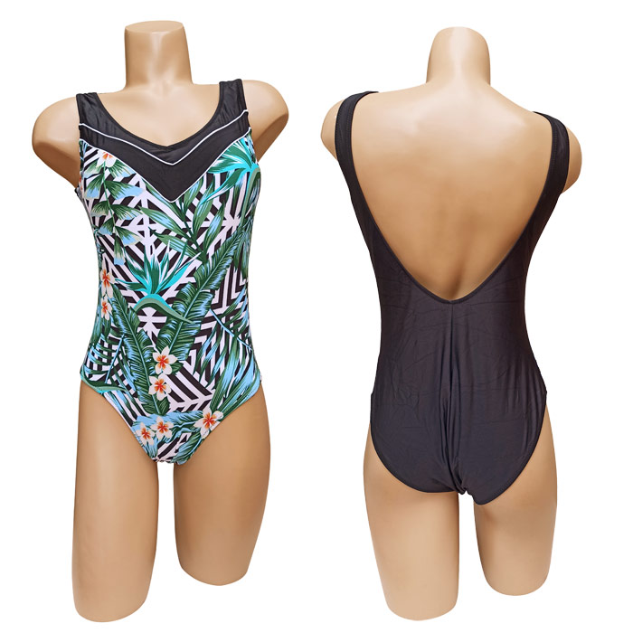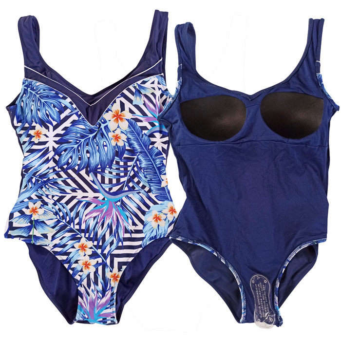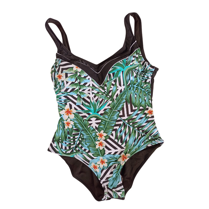 Maillot de bain femme 1 pièce, entièrement doublé. Soutien gorge forme bandeau, mousses lègères intégrées. Maillot imprimé "Feuilles de Palmiers et fleurs des îles" sur le devant, dos uni. Échancrure dos. Bretelles épaules. 2 couleurs et 5 tailles indiquées sur étiquette : 46-48-50-52-54.