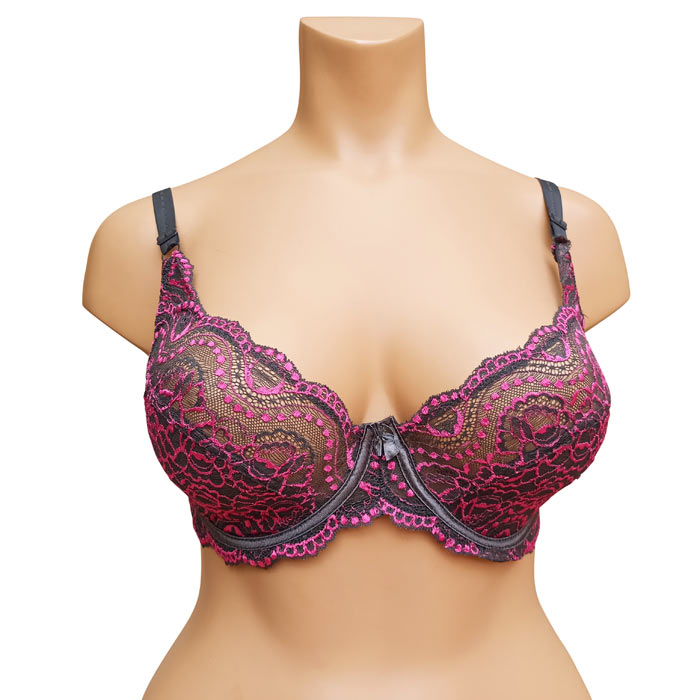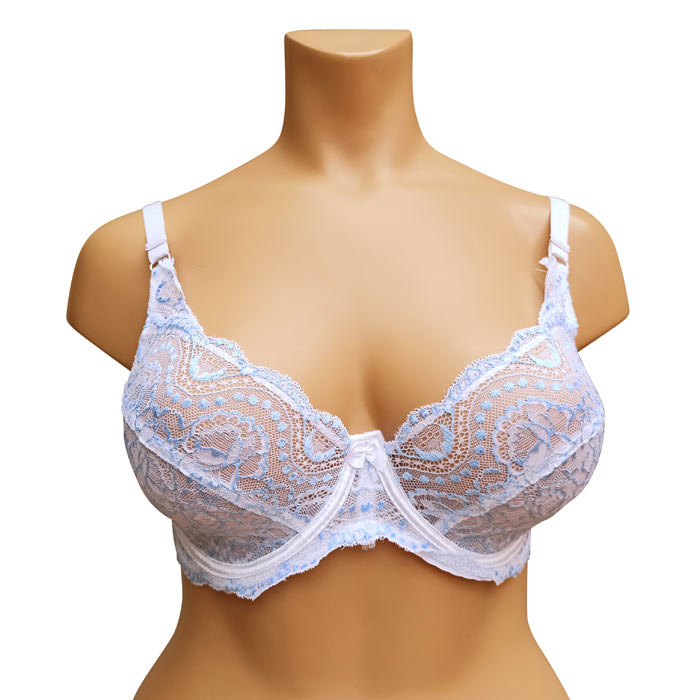 Soutien gorge grande taille, Bonnet D non rembourrés avec armatures. Soutien-gorge bicolore avec broderie sur maille filet stretch sur l'ensemble du bonnet. Dentelé sur la partie basse du bonnet à l'avant. Brides réglables, non amovibles. Fermeture dos 2 agrafes et 3 positions d'accroches. 6 tailles : de 90D à 115D.
