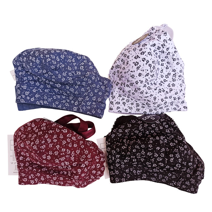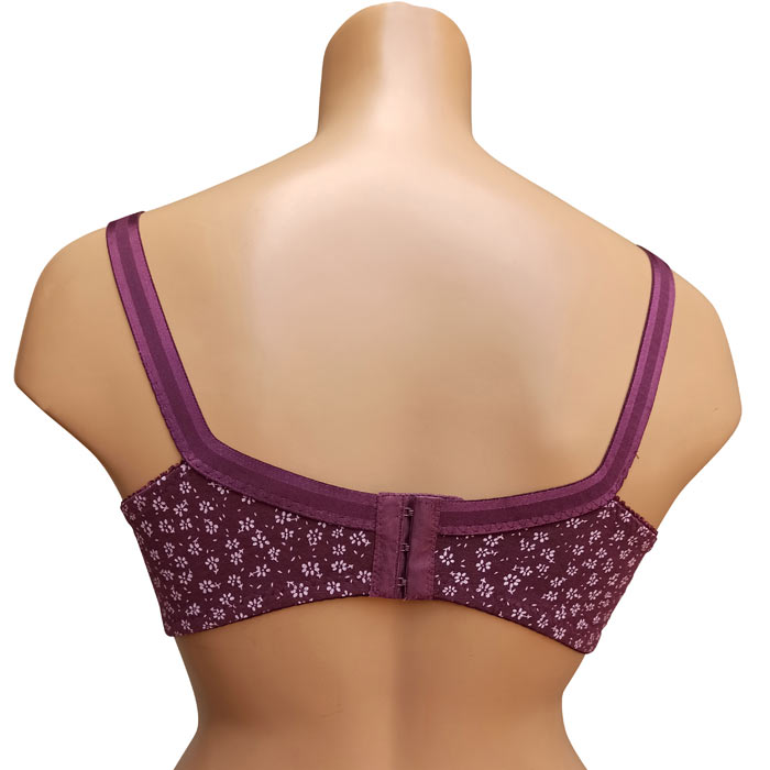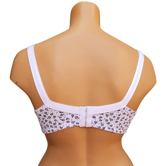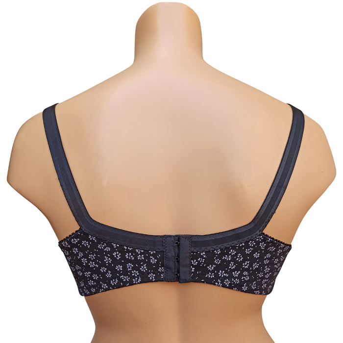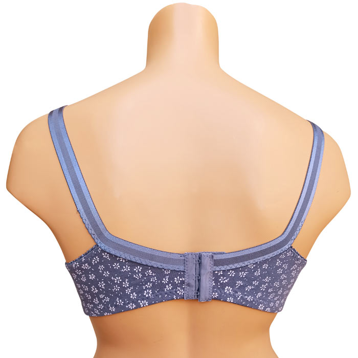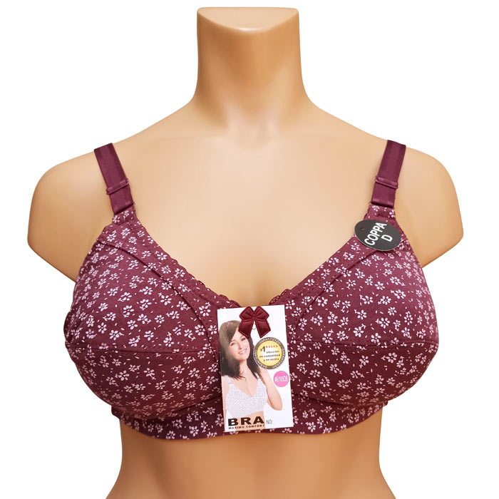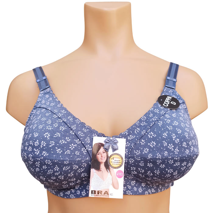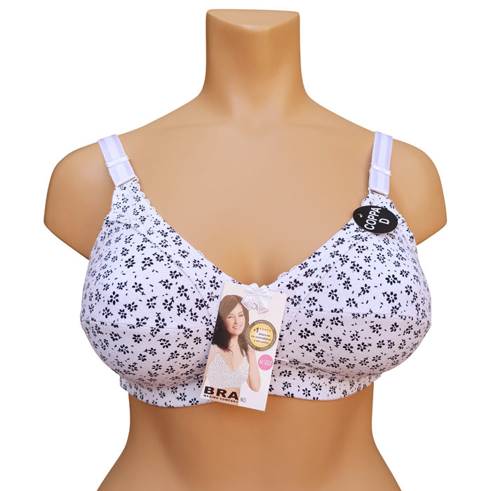 Soutien gorge grande taille, Bonnet D non rembourrés avec armatures. Soutien-gorge Coton majoritaire avec imprimé "fleurs". Brides réglables, non amovibles. Fermeture dos 3 agrafes et 3 positions d'accroches. 6 tailles : de 100D à 115D.