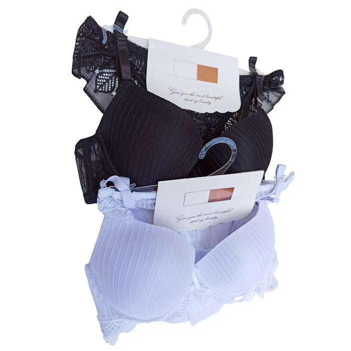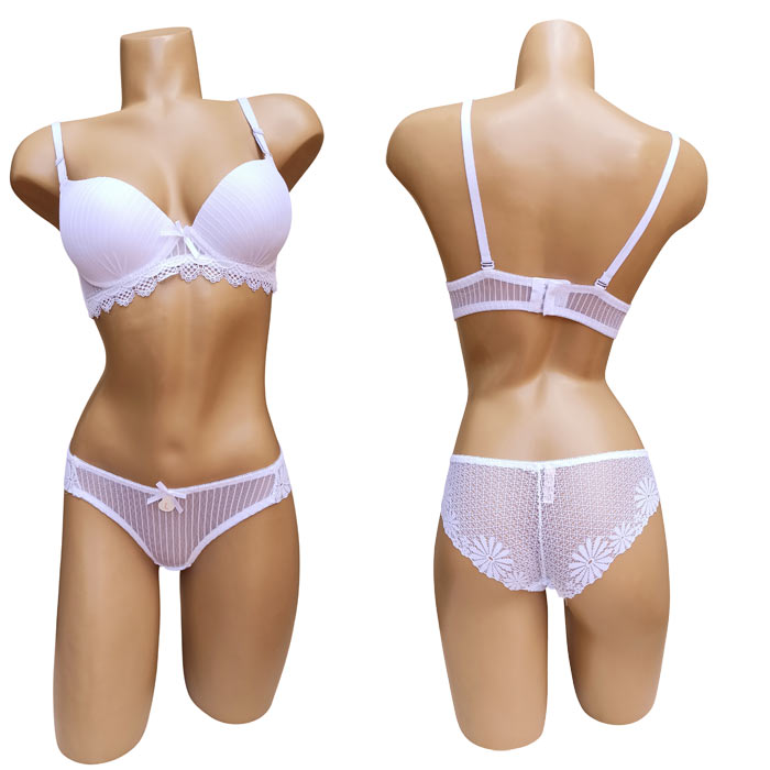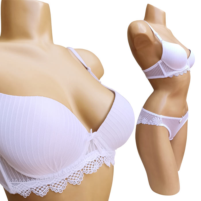 Ensemble soutien gorge avec slip. Soutien gorge bonnet C avec armatures. Soutien gorge coques souples et préformées. Broderie sur maille filet stretch, dentelle sous poitrine. Brides réglables et amovibles. Fermeture dos 3 agrafes et 3 positions d'accroches. Slip dentelle broderie sur maille filet stretch, doublé sur le fond. 6 tailles de soutien-gorge : 85C à 110C.