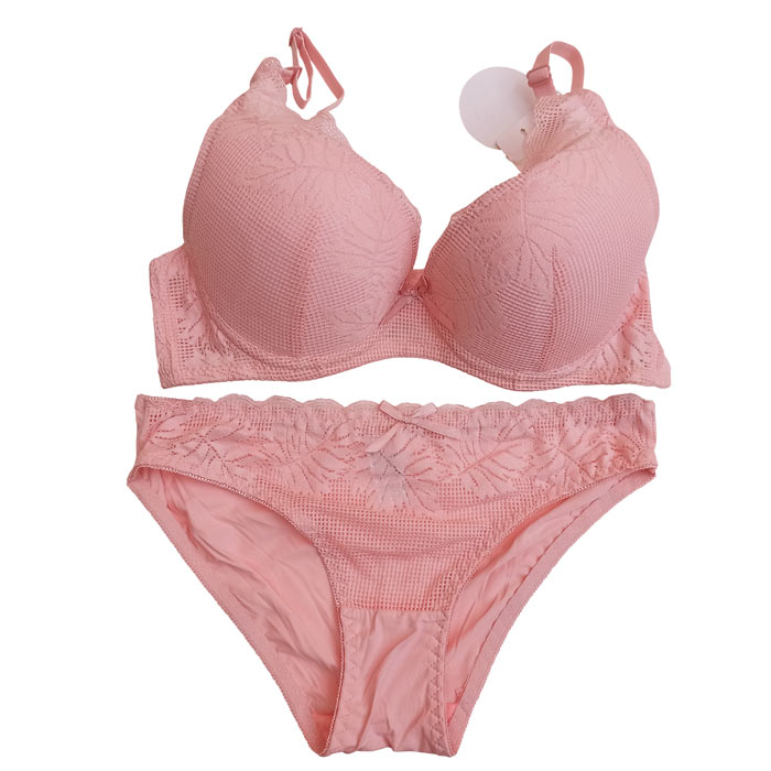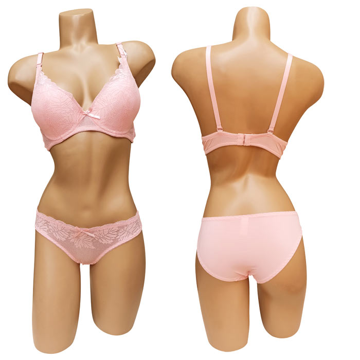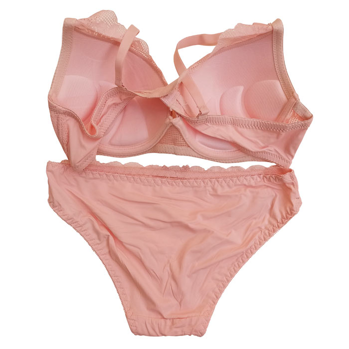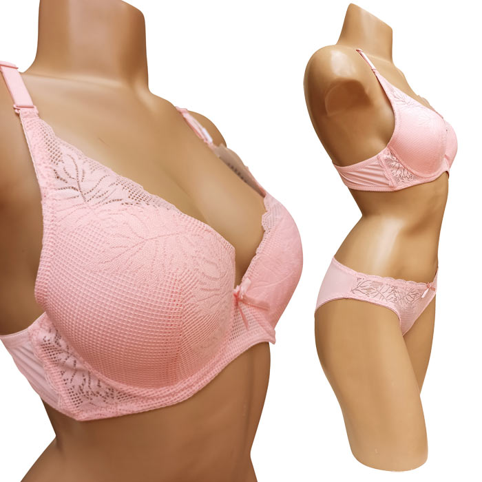 Ensemble soutien gorge avec culotte. Soutien gorge rembourrés coques souples avec armatures, forme triangle bonnet C. Broderie sur maille filet stretch. Nœud satiné entre-bonnet. Brides réglables et amovibles. Slip, rappel de la broderie sur le devant de la culotte, unie sur l'arrière. 6 tailles. Attention : Taille européenne indiqué sur étiquette.