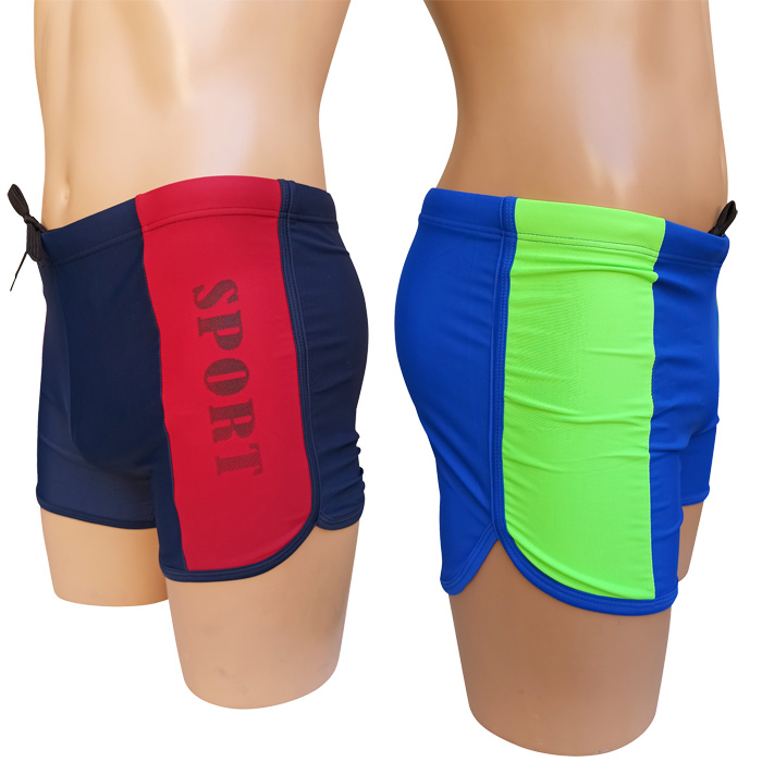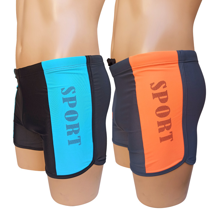 Boxer de bain homme, entièrement doublé. Lacet de resserrage à la taille. Boxer avec large bande colorée sur les côtés et inscription "SPORT" sur un côté. 5 tailles de 36/38 à 44/46.