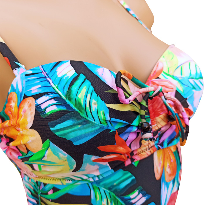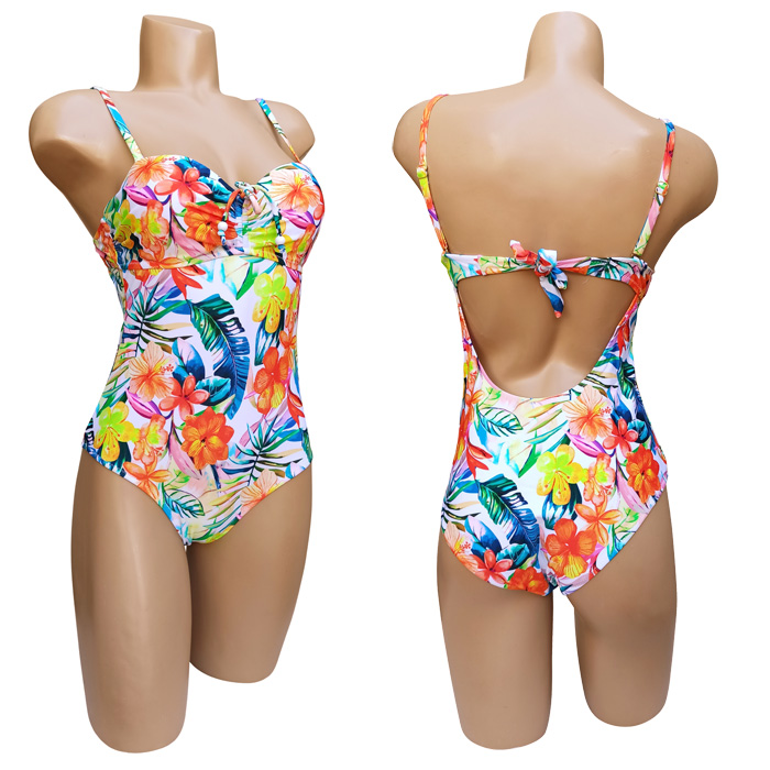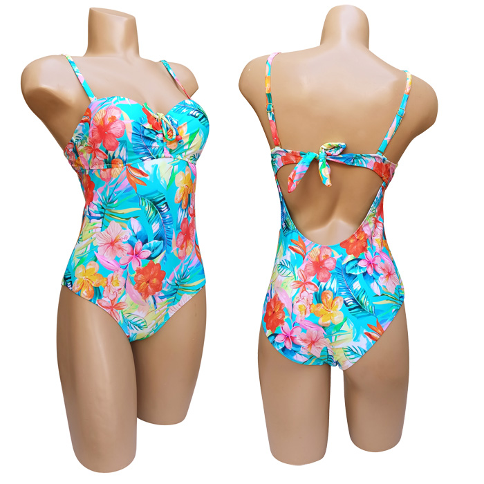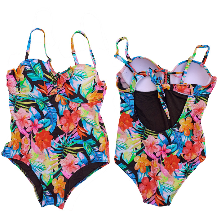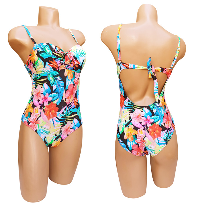 Maillot de bain femme 1 pièce, doublé devant et derrière. Soutien gorge coques avec armatures. Maillot "imprimé fleurs" sur l'ensemble. Bretelles amovibles et réglables avec attache dans le dos pour une meilleure tenue. 3 couleurs et 5 tailles.