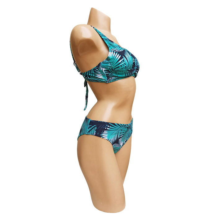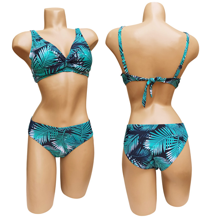 Maillot de bain femme 2 pièces. Soutien gorge forme triangle, sans armatures, petites mousses intégrées et amovibles. S'attache au dos. Bretelles réglables. Imprimé graphique "type feuilles palmiers" sur l'ensemble du maillot. 4 tailles: du 36/38 au 42/44.