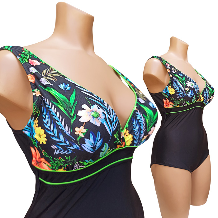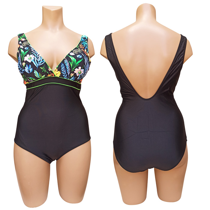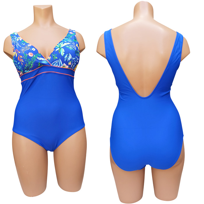 Maillot de bain femme 1 pièce, entièrement doublé . Soutien gorge forme triangle sans armatures, mousses amovibles. Maillot "imprimé fleurs" sur les bonnets. Bretelles épaule. 3 couleurs et 5 tailles indiquées sur étiquette.