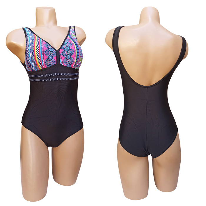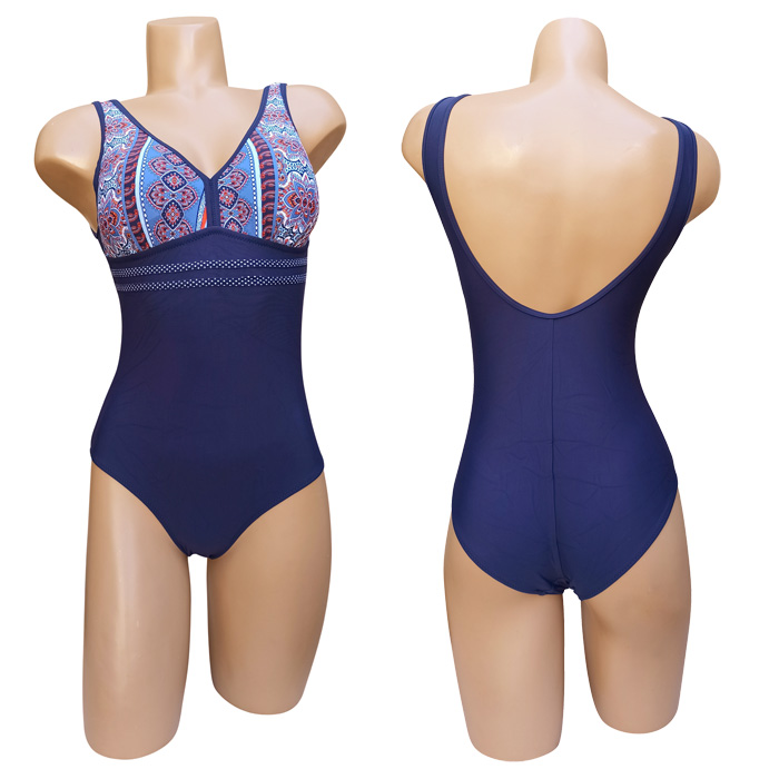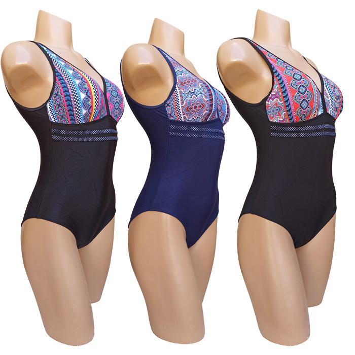 Maillot de bain femme 1 pièce, entièrement doublé . Soutien gorge forme triangle sans armatures, mousses amovibles. Maillot "motif aztèque" sur les bonnets et uni sur le bas avec 2 bandes fines sous poitrine. Bretelles épaule. 3 couleurs et 5 tailles indiquées sur étiquette.