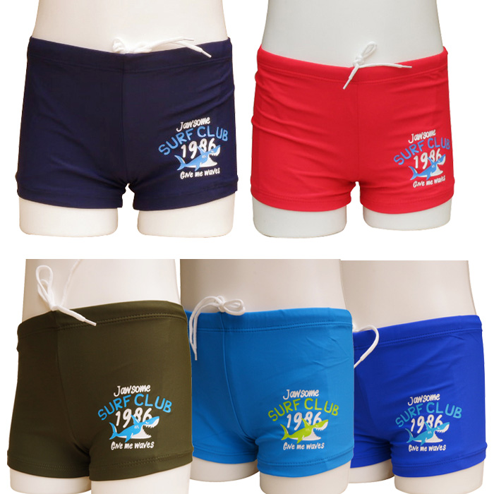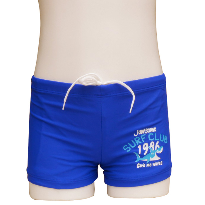 Boxer de bain garçon. Boxer uni avec Motifs requins et inscription "surf" sur le côté du boxer, tout ça déclinés en plusieurs coloris. Boxers doublés à l'avant avec lacet de resserrage à la taille. 5 tailles : 4/6 ans, 6/8 ans, 8/10 ans, 10/12 ans et 12/14 ans.