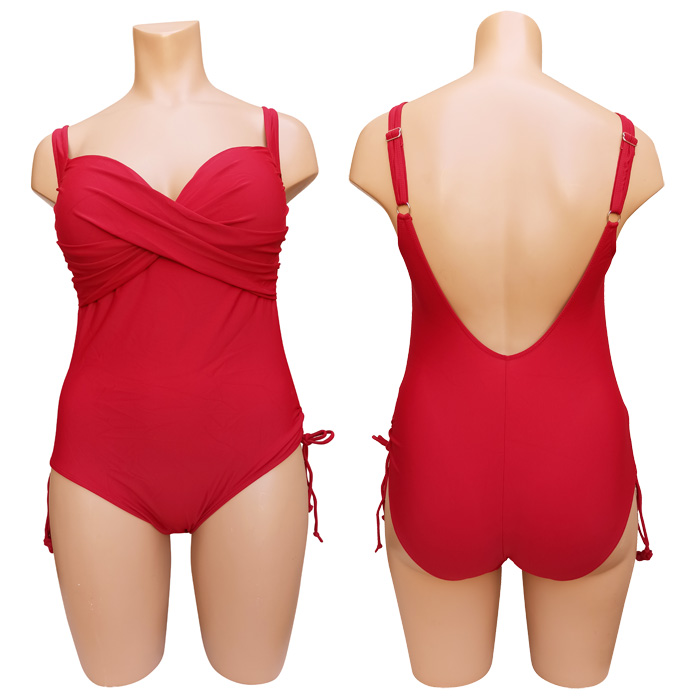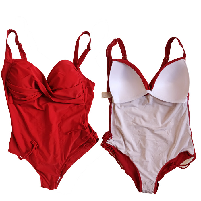 Maillot de bain femme 1 pièce, entièrement uni doublé à l'avant . Soutien gorge forme bandeau, coques souples, twisté sans armatures. Liens de resserrage au niveau des hanches. Bretelles réglables. 4 couleurs et 4 tailles indiquées sur étiquette.