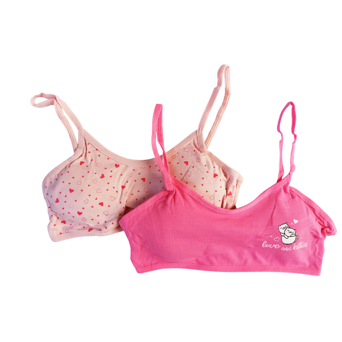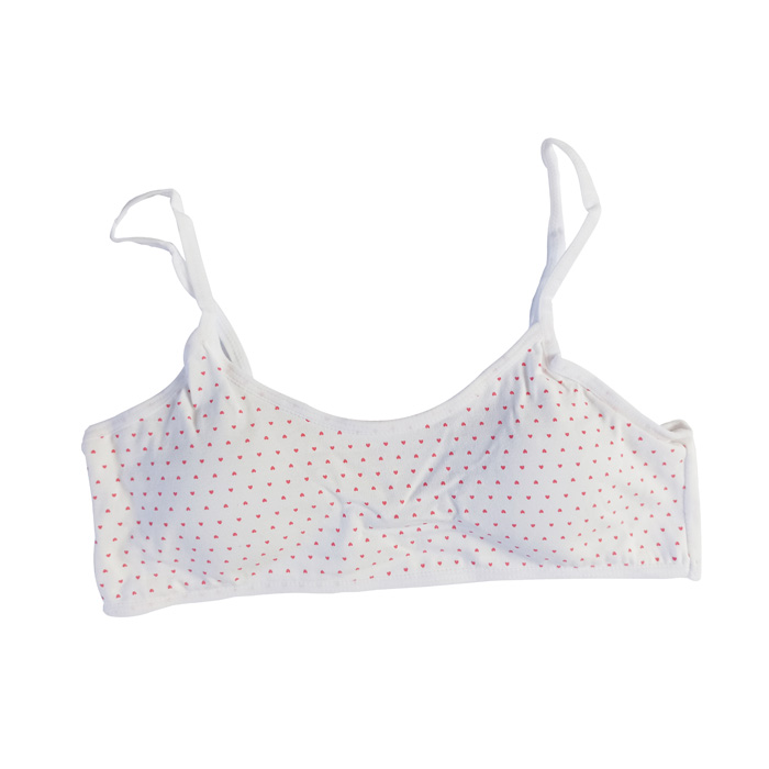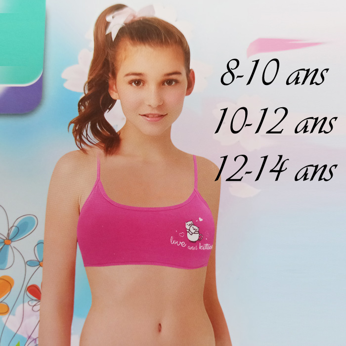 Brassière enfant confortable en coton. Brassière sans armatures avec imprimés différents. Petites mousses amovibles. Fines brides montantes sur épaules. Bande stretch sous poitrine . 3 coloris différents. 3 Tailles : 8/10 ans, 10/12 ans et 12/14 ans.