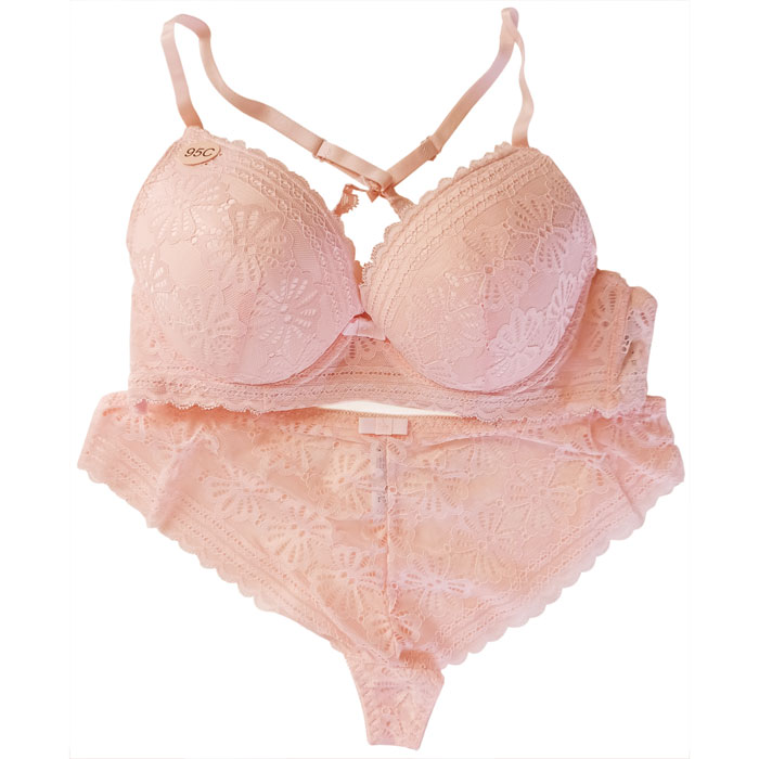 Ensemble soutien gorge avec slip en dentelle. Soutien-gorge coques moulées rembourrées avec armatures, bonnet C. Dentelle sur l'ensemble des bonnets. des Bretelles croisées au dos réglables et non amovibles. Nœud satiné entre-bonnet. Dos croisé en dentelle, fermeture 2 agrafes, 3 positions d'accroches. Culotte, rappel dentelle sur le devant et à l'arrière. 2 tailles :95C au 100C.