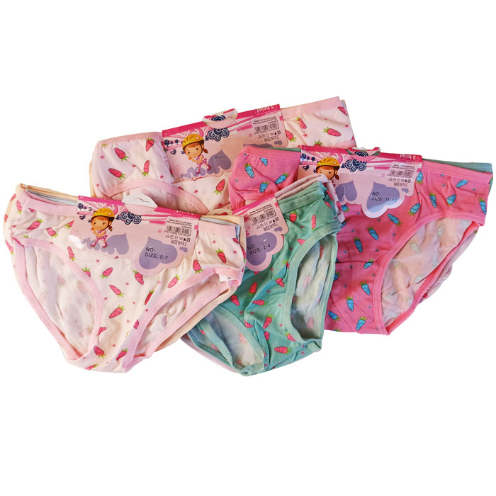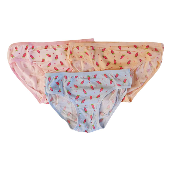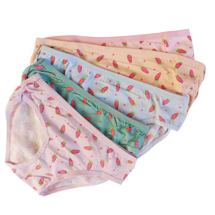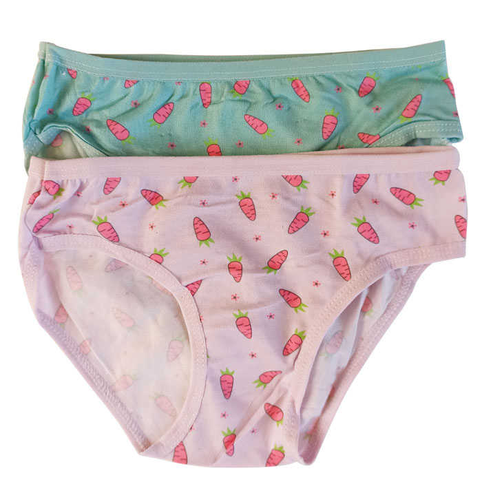 Slip fille confortable, coton majoritaire imprimé "carottes colorées". Culotte élastiquée à la taille. 6 coloris différents et 4 tailles : 2/4 ans 5/7 ans, 8/10 ans, 10/12 ans.
