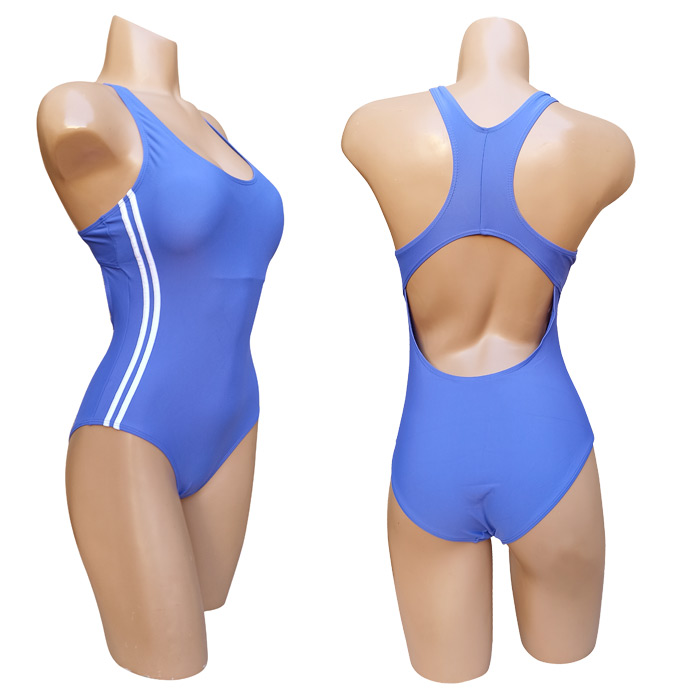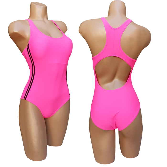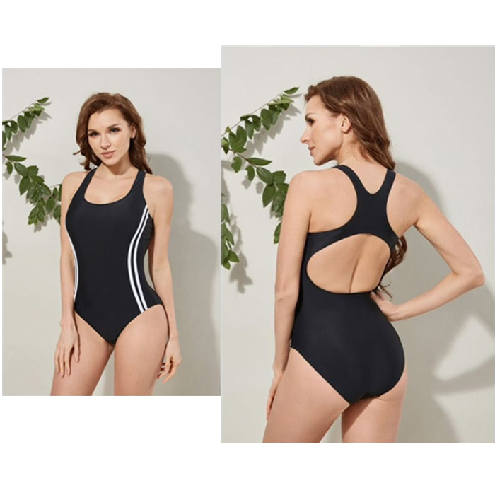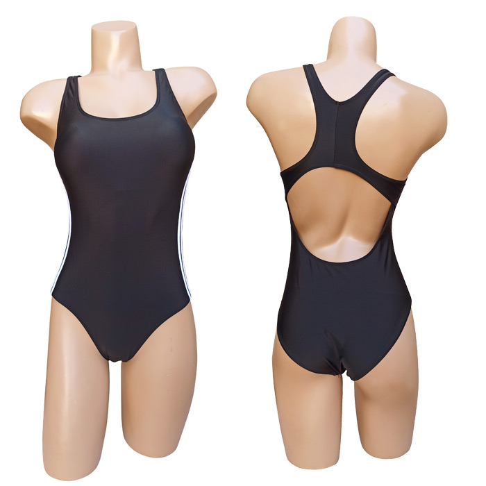 Maillot de bain femme 1 pièce. Maillot Piscine, doublé à l'avant . Soutien gorge forme bandeau sans armatures. Mousses intégrées et amovibles. Dos nageur. Bandes verticales de chaque côté. 3 couleurs et 5 tailles indiquées sur étiquette.