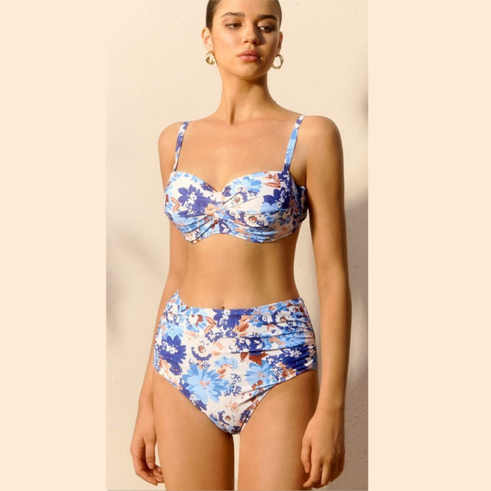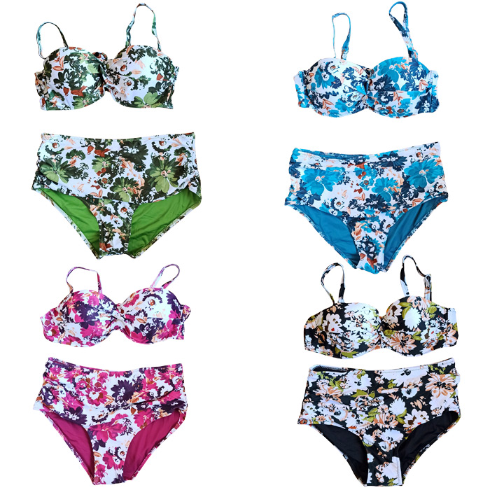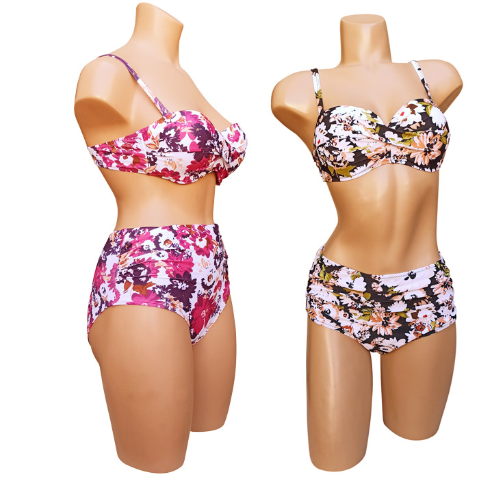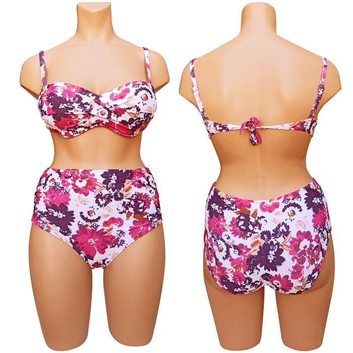 Maillot de bain femme 2 pièces. Soutien gorge forme bandeau twisté, coques souples avec armatures. S'attache au dos. Bretelles réglables. Imprimé "floral" sur l'ensemble du maillot. Bas du maillot taille haute avec effet plissé sur le ventre. 4 tailles: du 38/40 au 44/46.