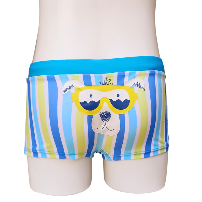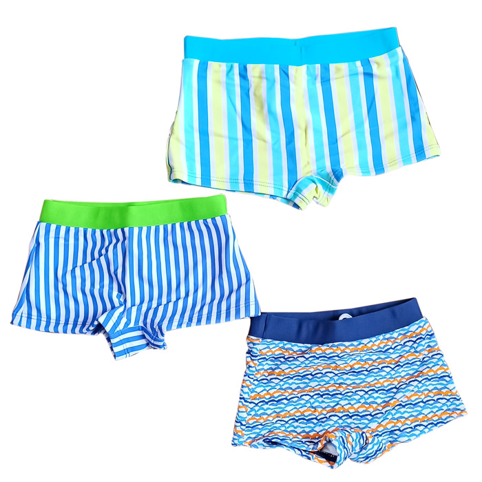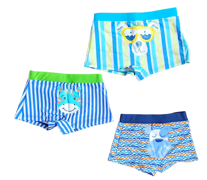 Boxer de bain garçon , doublé à l'avant. Taille élastiquée et lacet de resserrage à la taille. Imprimé différents sur l'ensemble du maillot avec motif sur le derrière. 4 tailles : 1/2 ans - 2/4 ans - 4/6 ans - 6/8 ans. 3 couleurs différentes. Livré dans des sachets individuels.