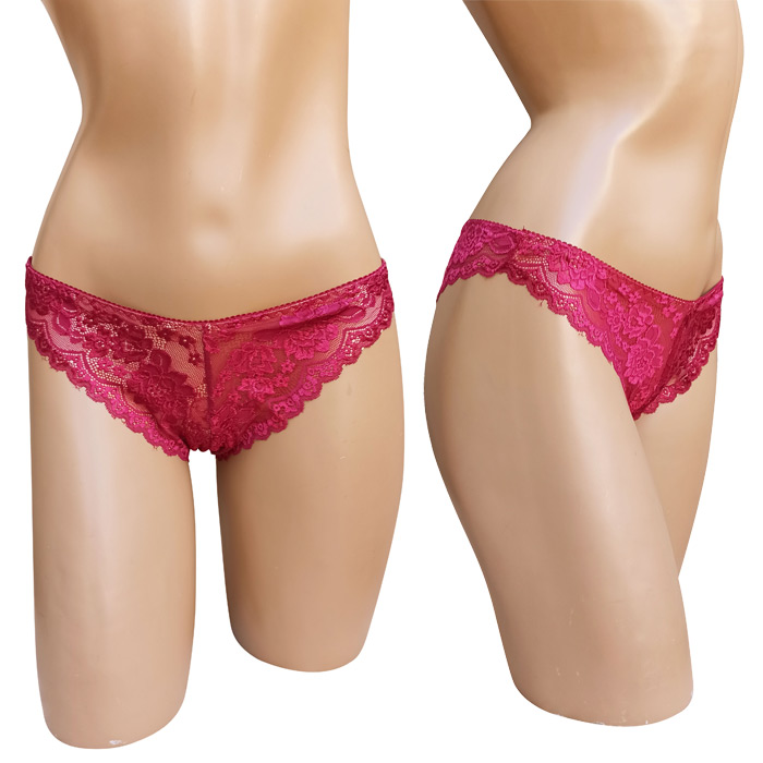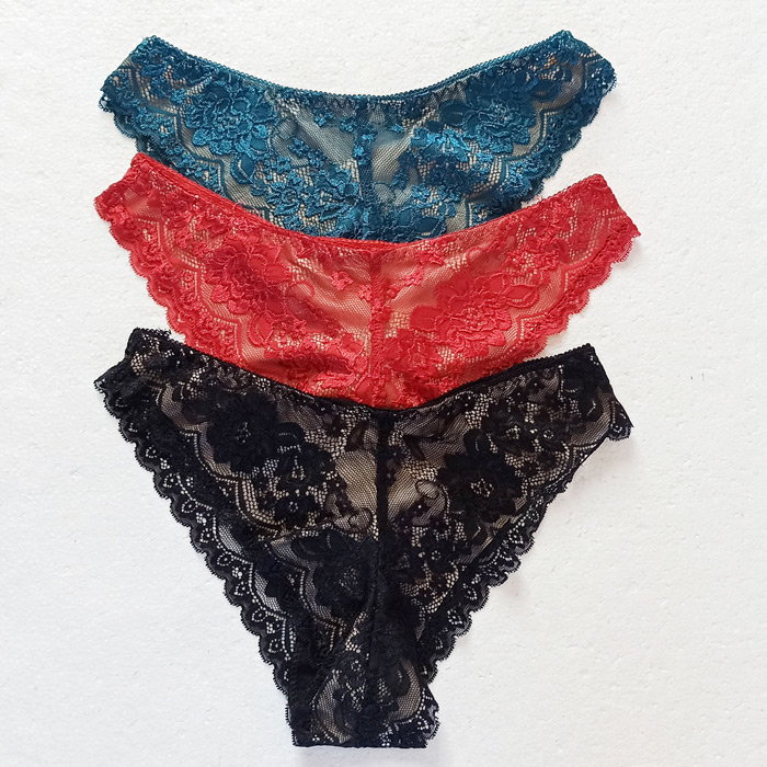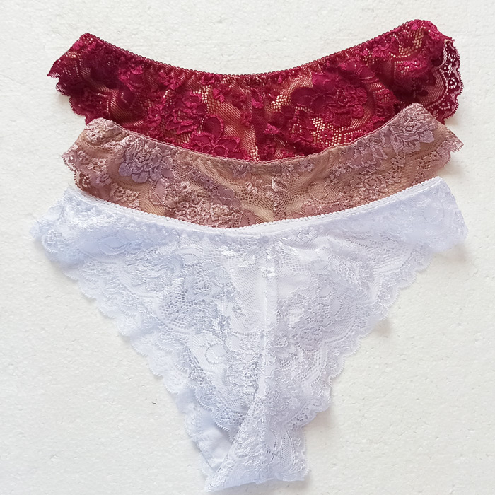 Slip brésilien, broderie "fleurs" sur maille filet stretch - Doublé à l'avant. Taille élastiquée. 3 tailles : M, L et XL.