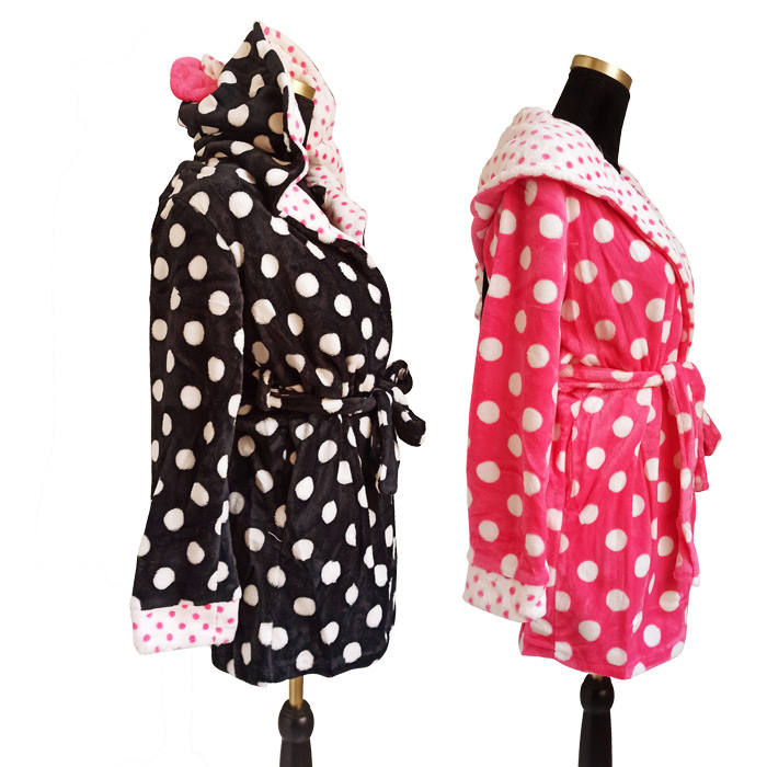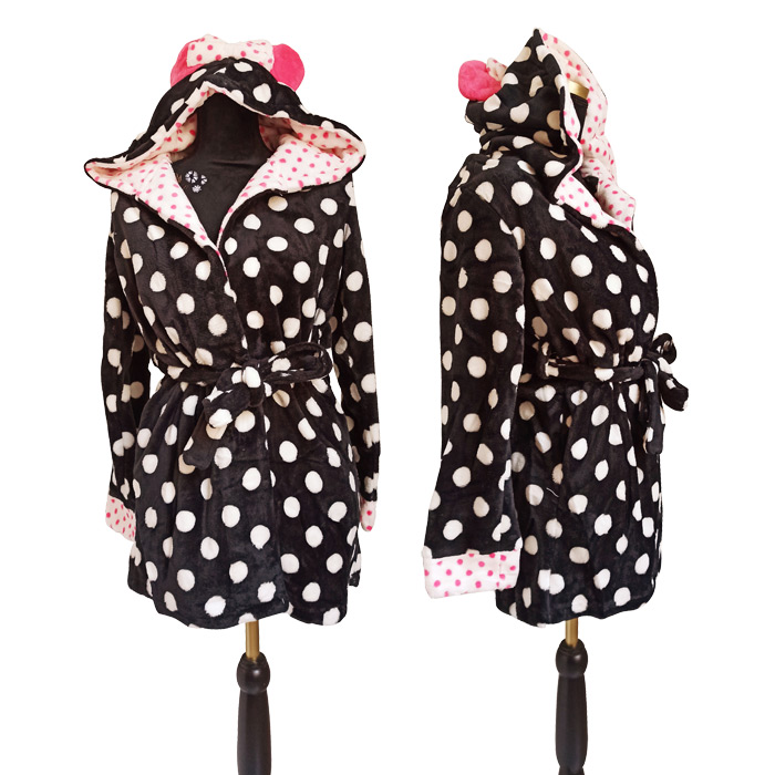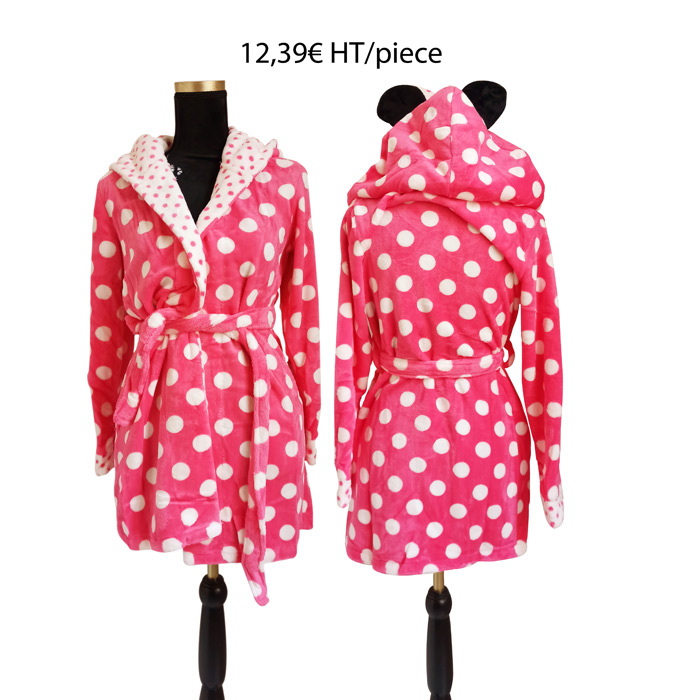 Peignoir de chambre femme avec attache sur le devant et à l'intérieur. Longueur mi-cuisse. Imprimé "pois sur l'ensemble. Capuche avec oreilles de "Minnie et nœud. Doux et confortable. 4 tailles : S-M-L-XL. Conditionné en sachet individuel.