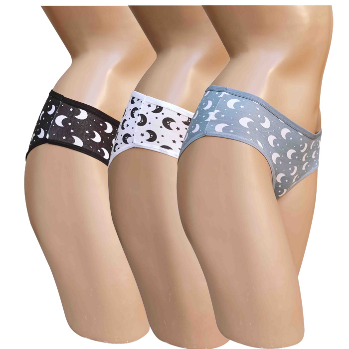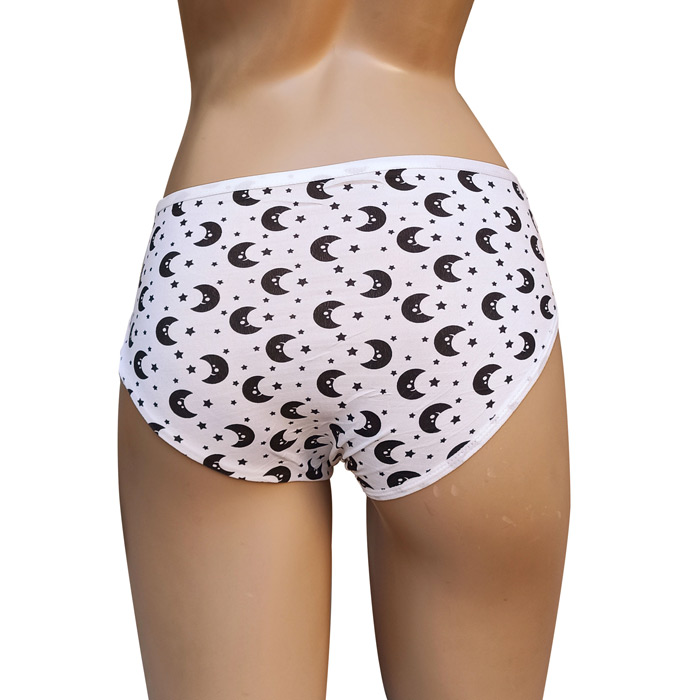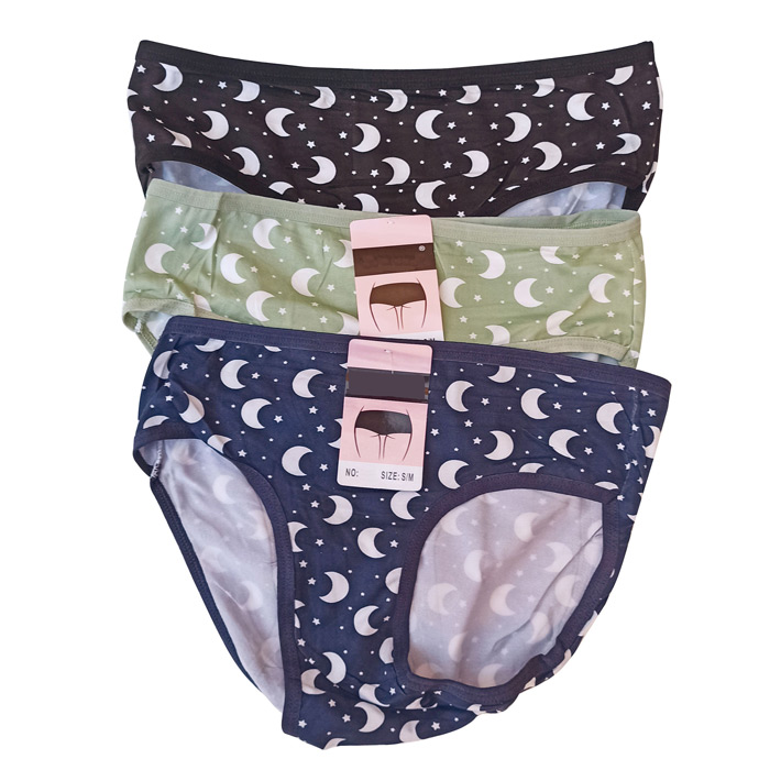 Slip femme, coton majoritaire. imprimé "lunes et étoiles" sur l'ensemble de la culotte. Différents coloris dans le paquet. Taille élastiquée. Fond doublé. 2 Tailles.
