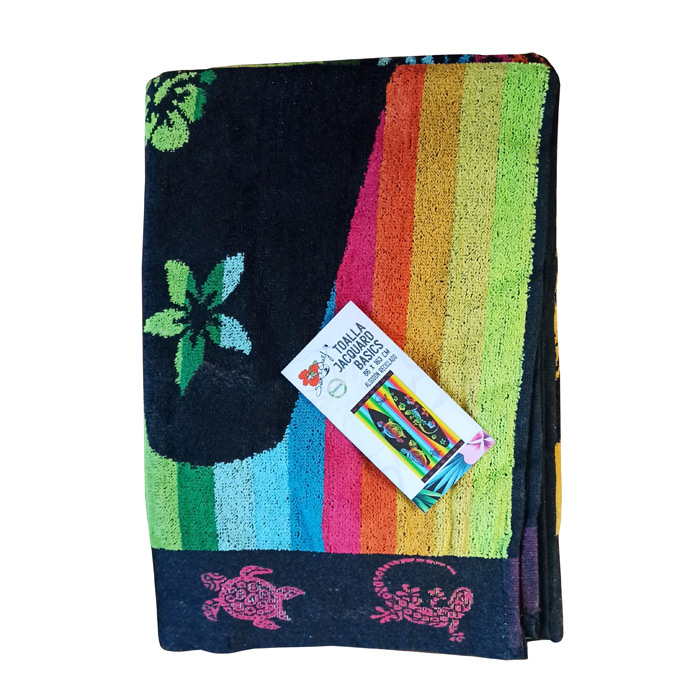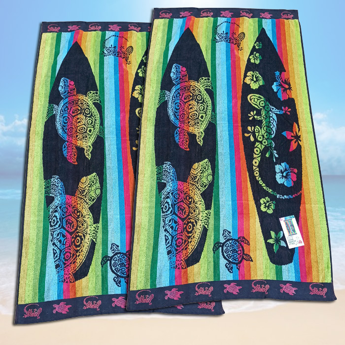 Grande serviette de plage en COTON RECYCLE. Motif "planche de surfs" sur fond rayures multicolore. Dimension : 86x163.