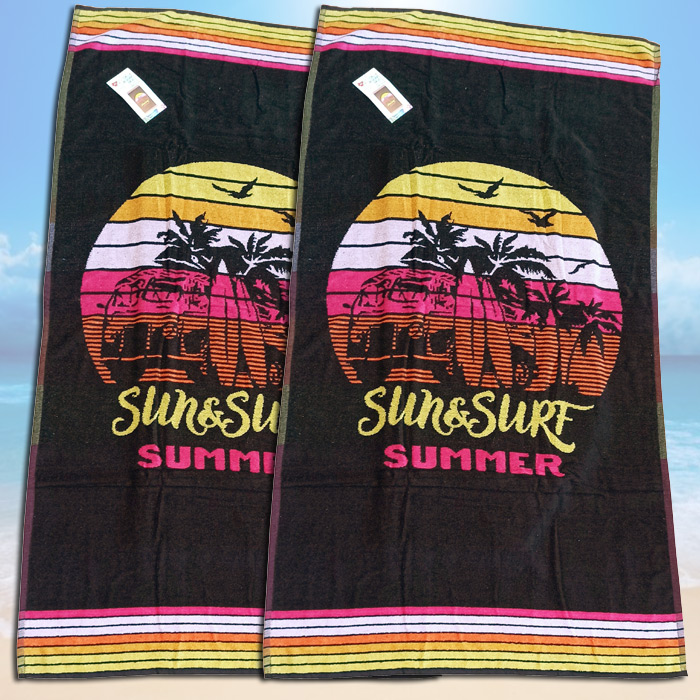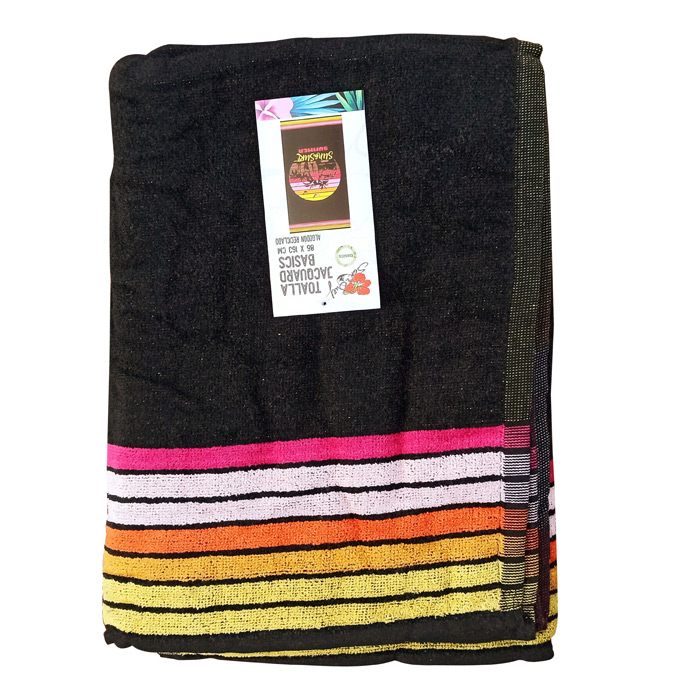 Grande serviette de plage en COTON RECYCLE. Serviette noire avec rayures multicolore et inscription. Dimension : 86x163.