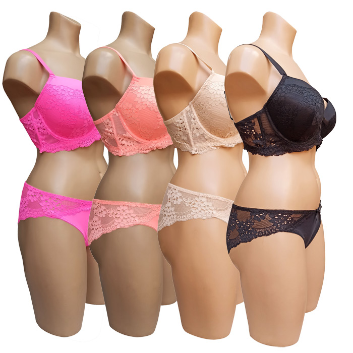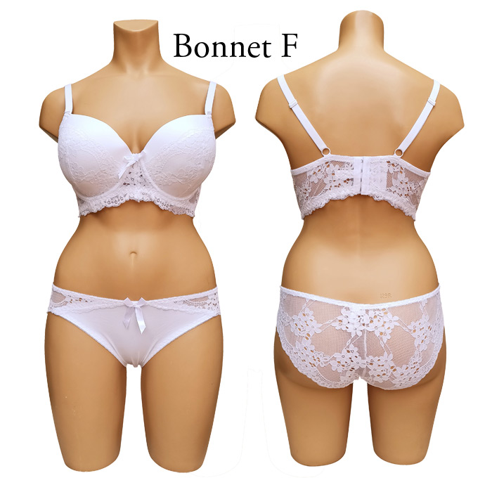 Ensemble soutien-gorge grande taille, bonnet F, soutien gorge coques souples avec armatures. Soutien gorge dentelle "fleurs" sur maille résille stretch sur l'ensemble du bonnet. Dos fermeture 4 agrafes 4 positions d'accroches. Bretelles réglables et non amovibles. Culotte tout en dentelle avec 2 bandes de dentelle fleurie sur les côtés et dentelle à l'arrière. Livré sur cintre. 4 Tailles : 95F à 110F dont 100F et 105F en double