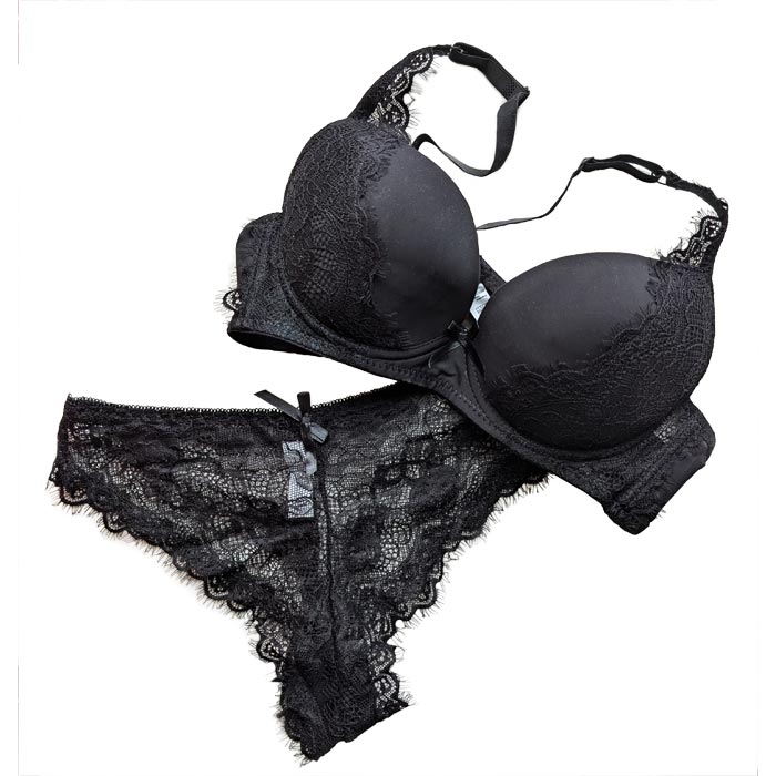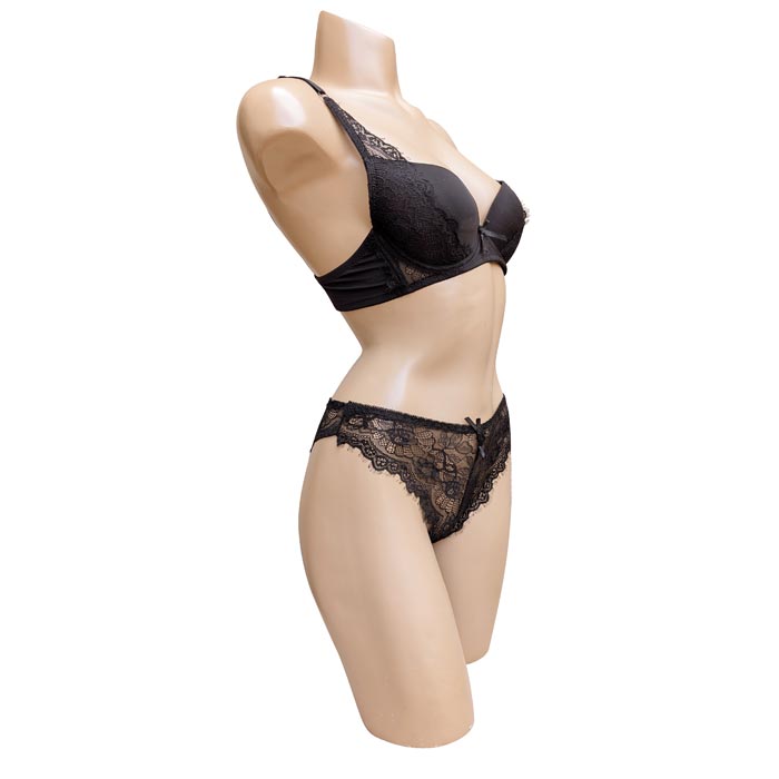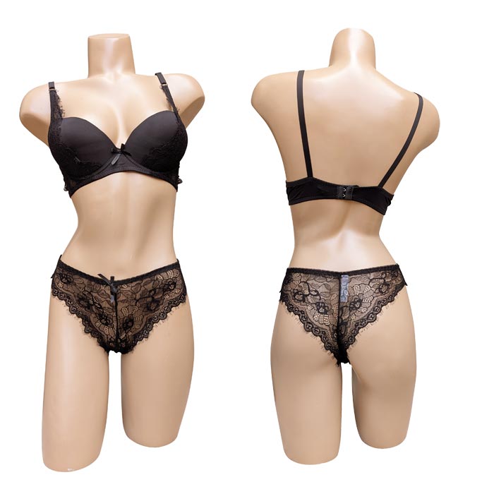 Ensemble soutien-gorge Push up, bonnet C, soutien gorge coques souples, rembourrées avec armatures. Soutien gorge dentelle "fleurs" sur maille résille stretch sur la partie inférieure du bonnet. Nœud satin entre-bonnet. Dos fermeture 2 agrafes 3 positions d'accroches. Bretelles réglables et non amovibles. Tanga en dentelle devant et derrière. Livré sur cintre. 5 Tailles : 85C à 105C dont 90C, 95C et 100C en double.