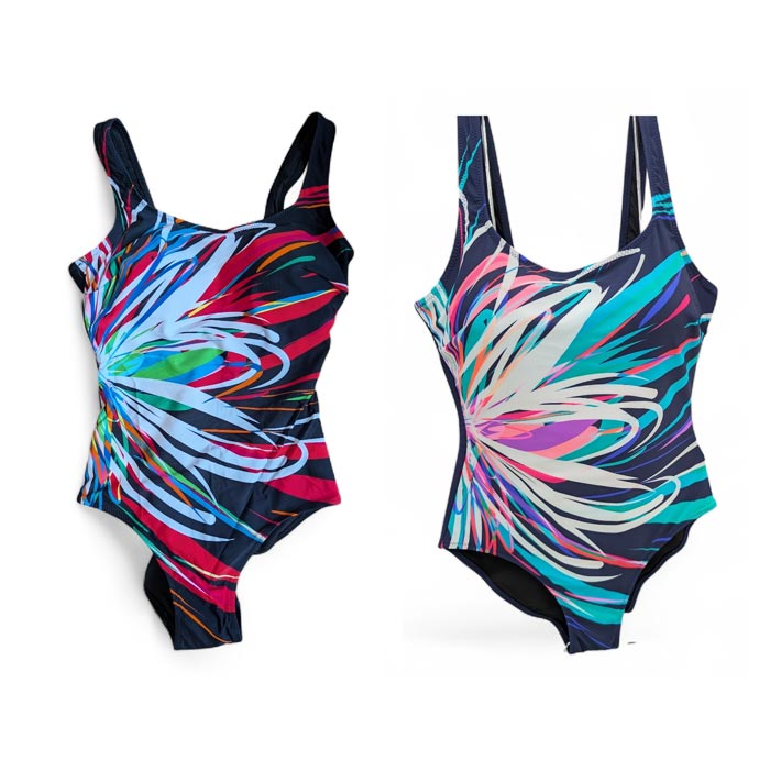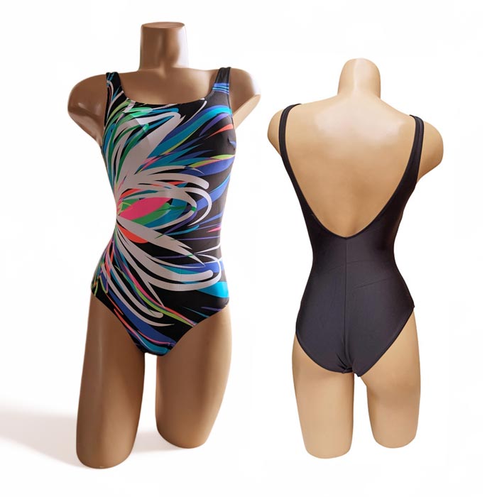 Maillot de bain femme 1 pièce, entièrement doublé. Maillot "imprimé graphique sur le devant, dos uni. Échancrure dos. Bretelles épaules. 3 couleurs et 4 tailles indiquées sur étiquette : 44-46-48-50 (Italienne). Livré avec cintres.