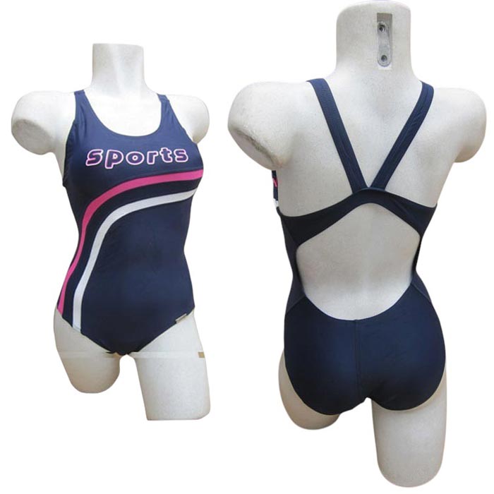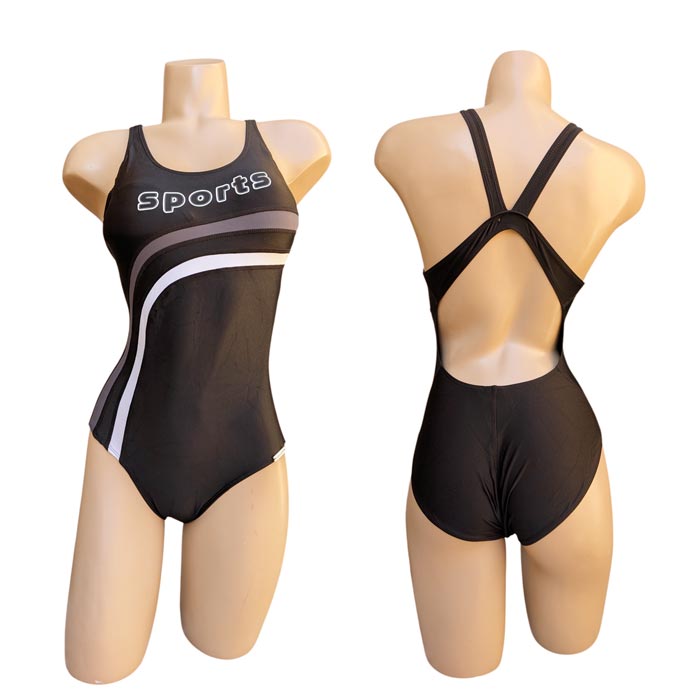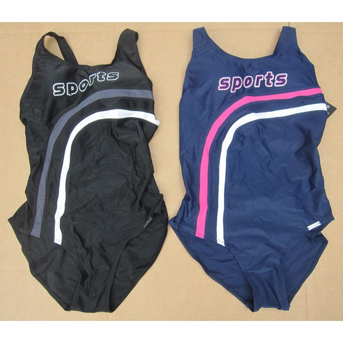 Maillot de bain 1 pièce spécial "natation"- soutien gorge fin amovible , s'attache avec des brides à l'intérieur- dos nageur- encolure carrée- inscription "SPORTS" sur la poitrine , 2 bandes bicolores contrastées à l'avant. 4 tailles