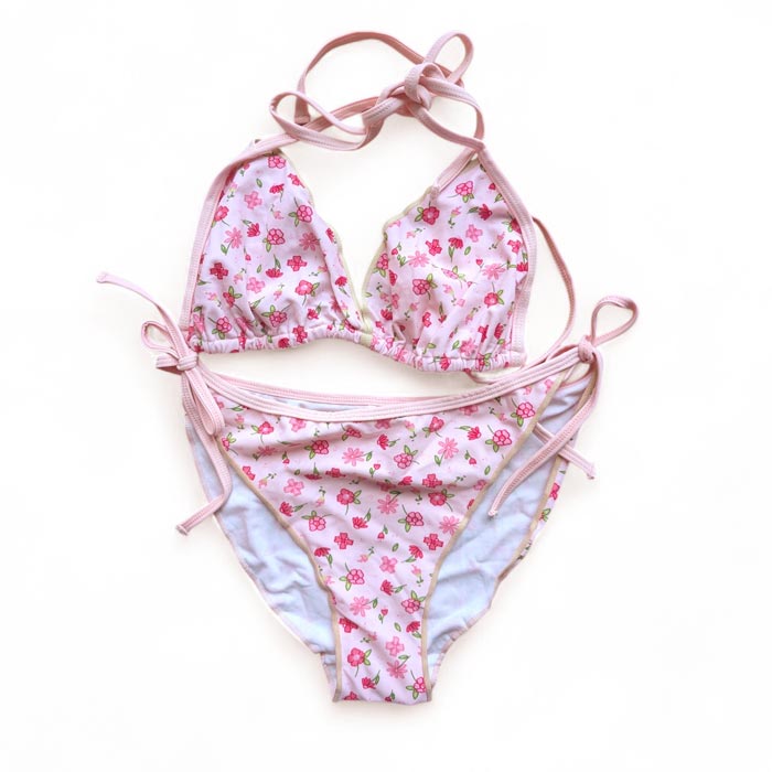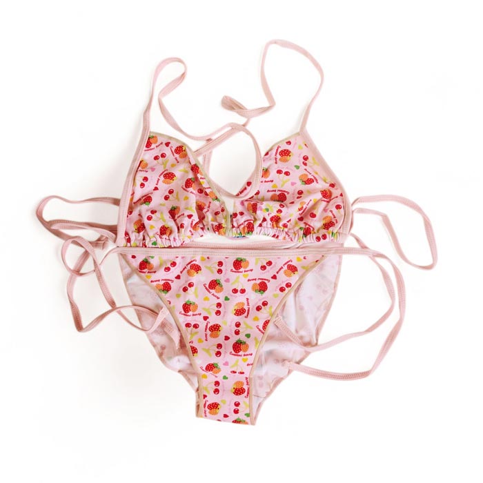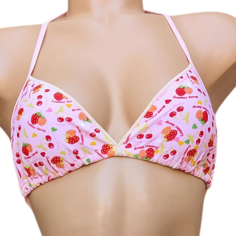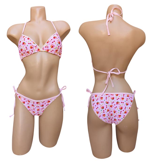 Maillot de bain 2 pièces avec slip. Soutien gorge forme triangle sans armatures. Soutien gorge à nouer façon foulard au cou et au dos. Slip ajustable sur les côtés par des brides. Imprimé "Fruits rouges" ou "imprimé Fleurs rouges" sur l'ensemble du maillot. 6 tailles.
